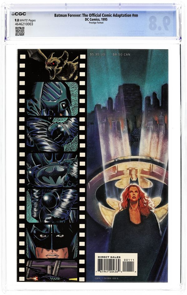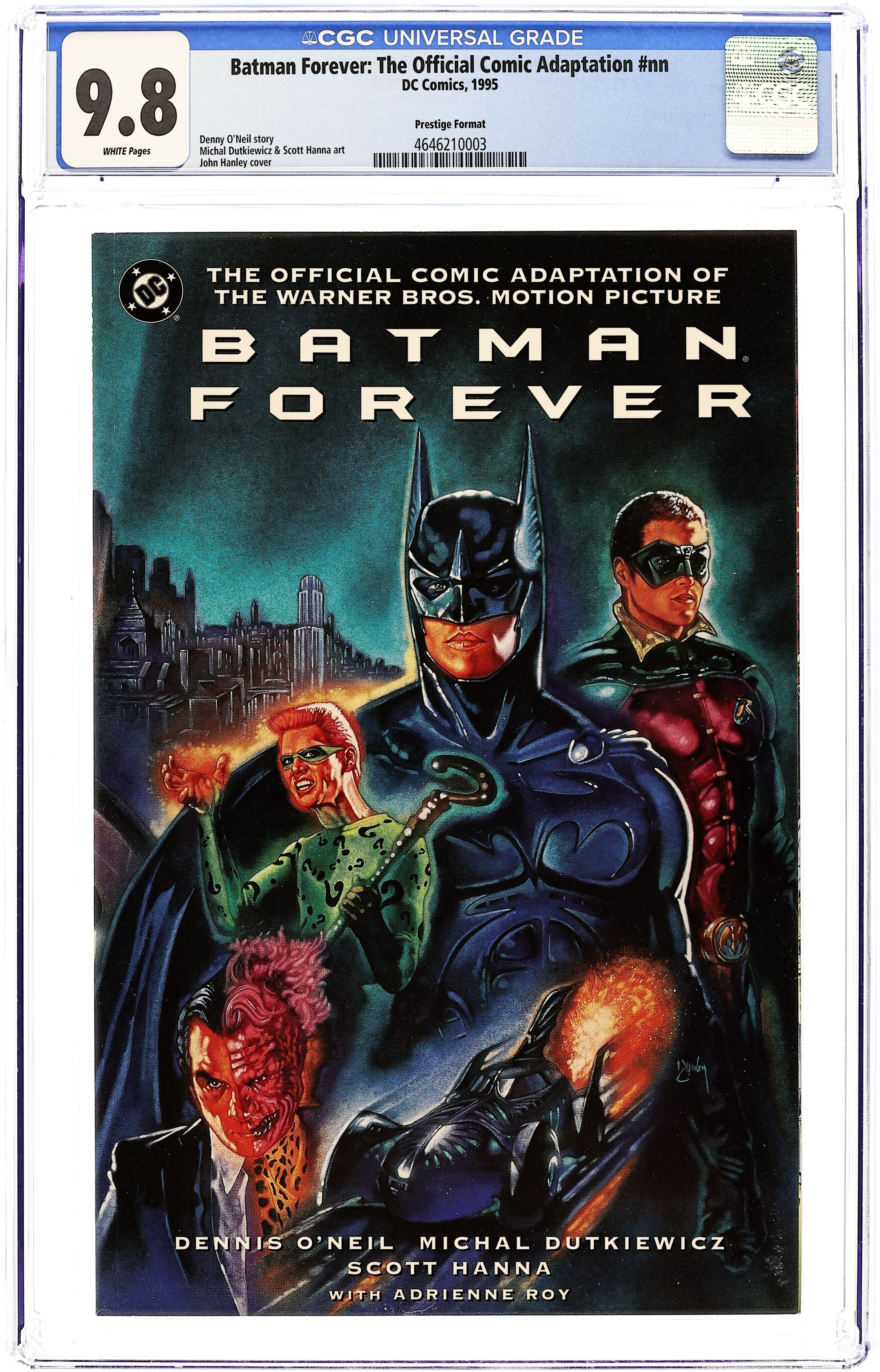 Unbagged Prestige Format painted cover by John Hanley. The film Batman Forever is directed by Joel Schumacher and stars Val Kilmer as Batman, Tommy Lee Jones as Two-Face, Jim Carrey as the Riddler, Chris O'Donnell as Robin and Nicole Kidman as criminal psychologist Dr. Chase Meridian. The BATMAN FOREVER MOVIE ADAPTATION is a tour de force of crimebusting action and sinister intrigue, written by Batman legend Dennis O'Neil, with art by Michael Dutkiewicz and Scott Hanna. 68 pages. $5.95 cover. White title, Batmobile on cover. Cover price $5.95.