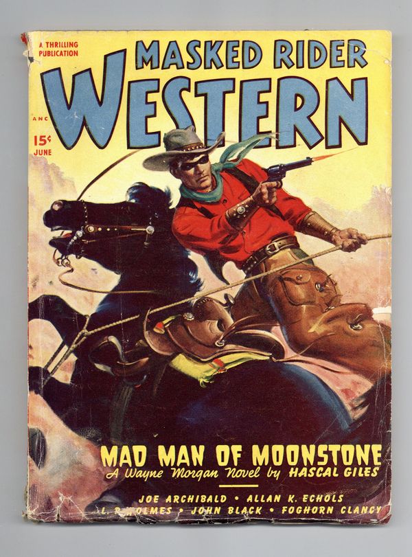 June 1948. Western adventures stories featuring "Mad Man of Moonstone" by Hascal Giles, and "Heir to Gunsmoke" by Joe Archibald. 7-in. x 9 1/2-in., 114 pages, Text (with B&W illustrations). Unevenly trimmed Newsprint pages. Cover price $0.15.
