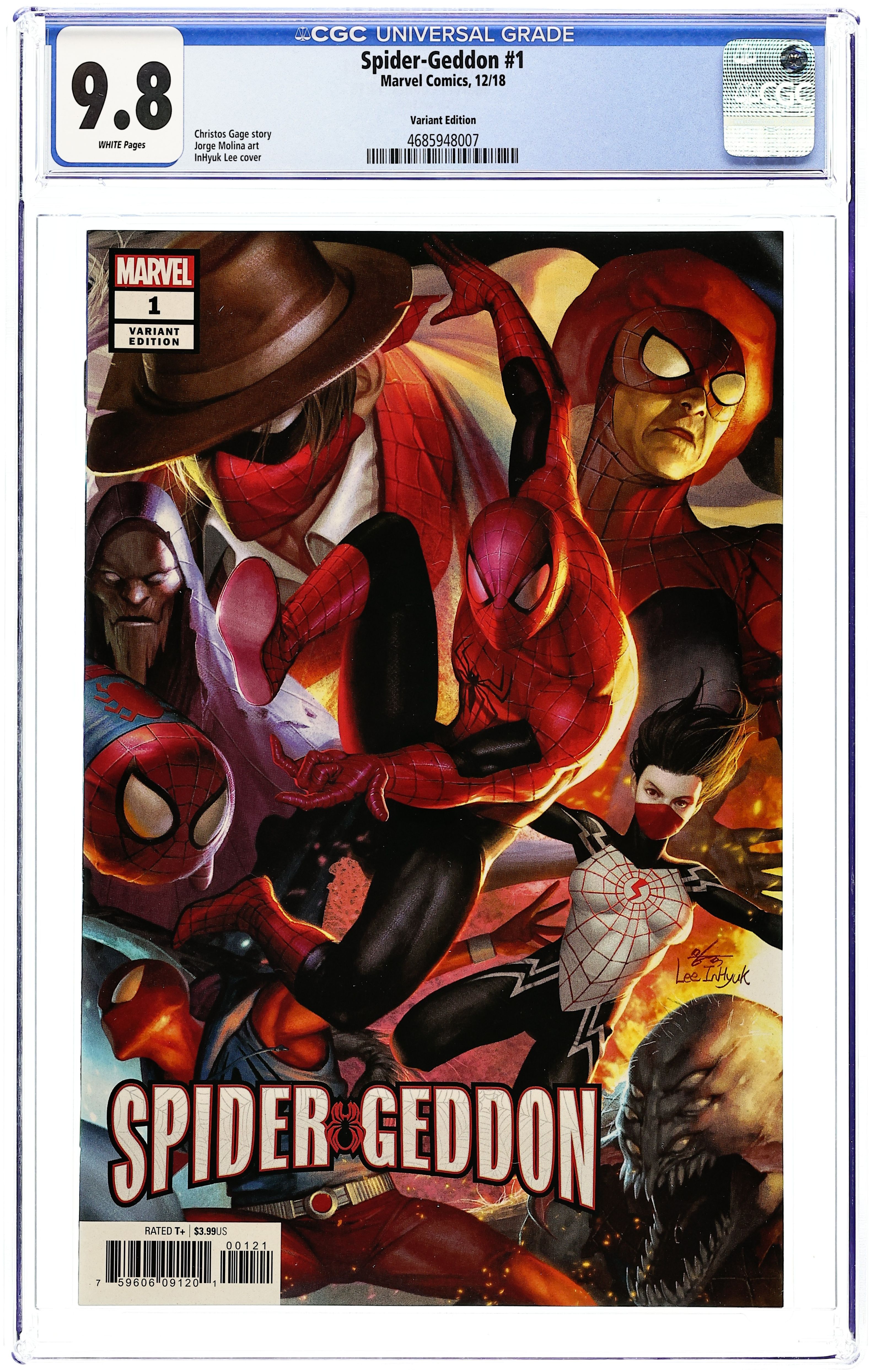 Written by Christos Gage and Dan Slott. Art by Jorge Molina. Cover by In-Hyuk. Lee REVENGE OF THE SPIDER-VERSE! Back in 2014, SPIDER-VERSE brought every Spider-Man ever together. This event spinning out of AMAZING SPIDER-MAN #800 has Christos Gage and Dan Slott teaming up to destroy them all. The Inheritors have somehow gotten out of their radioactive prison planet and made their way to the Marvel Universe. It's going to take a whole Spider-Army to keep them from TAKING IT ALL! Starring Spider-Man, Doctor Octopus, Spider-Gwen, Miles Morales, Spider-Woman, the Spider-Man from the anticipated video game and, well, every Spider-Man and Spider-Woman ever, including some brand-new ones! With Jorge Molina on art, the END OF ALL SPIDERS never looked so good! 28 pages, full color. Rated T+ Cover price $3.99.