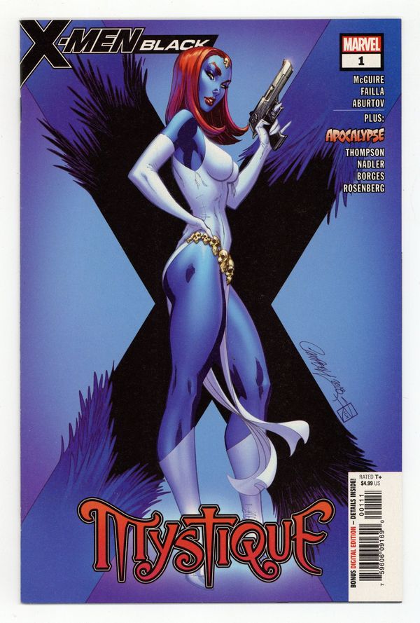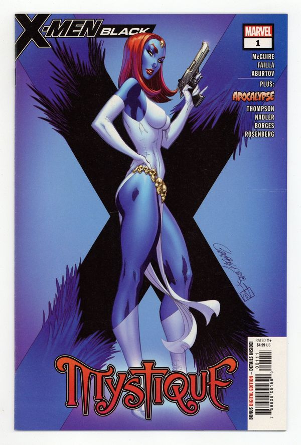 Written by Seanan McGuire, Zac Thompson and Lonnie Nadler. Art by Marco Failla and Geraldo Borges. Cover by J. Scott Campbell. THAT'S SO RAVEN! What's a day in the life for Raven Darkholme, A.K.A. Mystique? Brutal kills, revenge-fueled chills, seductive thrills...and that's all before breakfast! Award-winning author Seanan McGuire (X-MEN GOLD ANNUAL #2) and rising star Marco Failla take Marvel's multifaceted mutant murderess for a spin! : Includes X-MEN BLACK - Apocalypse: Degeneration: Part 3 of 5 the back up story continued from X-Men Black: Mojo (2018) and continues in X-Men Black: Juggernaut (2018). 36 pages, full color. Rated T+ Cover price $4.99.