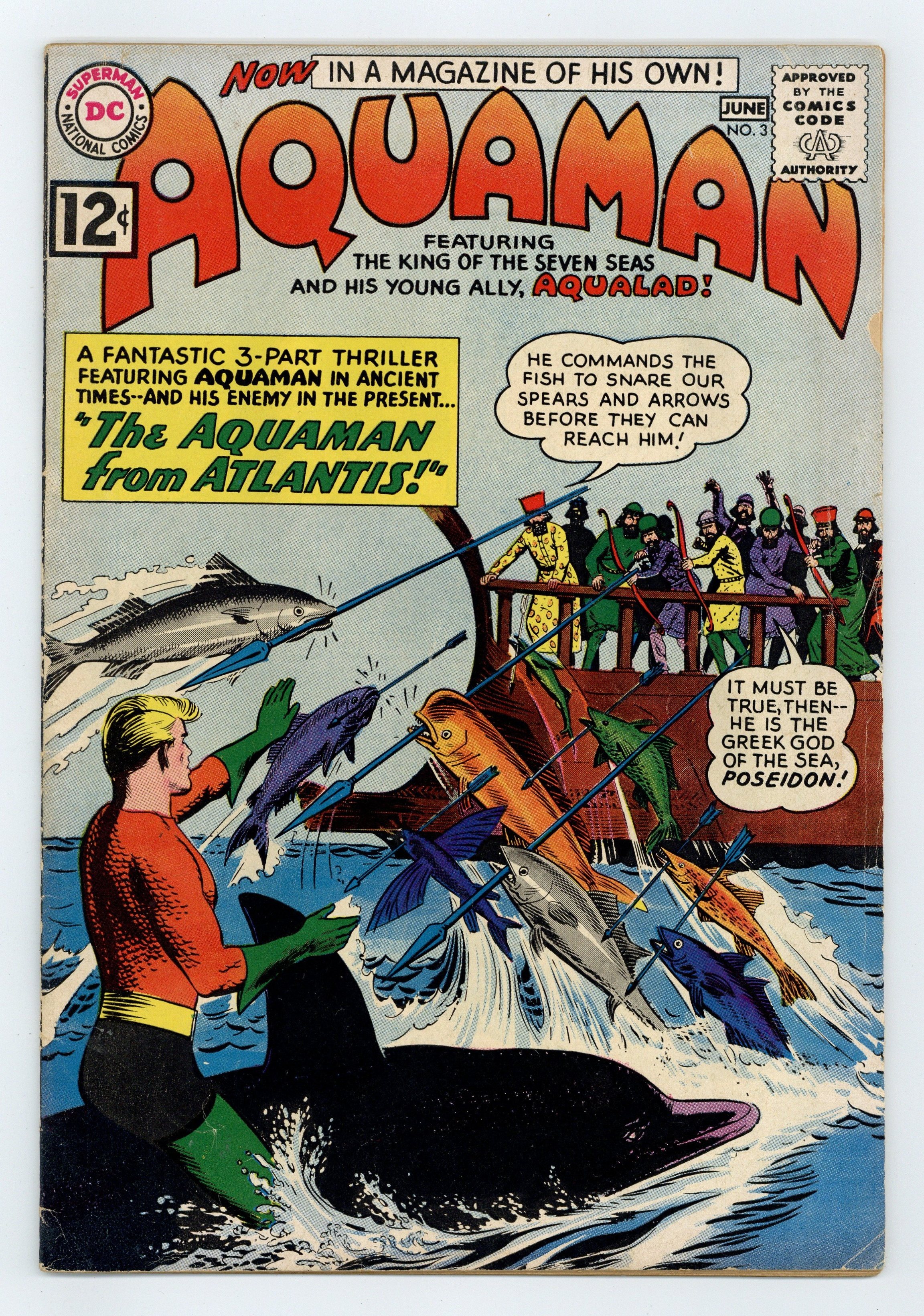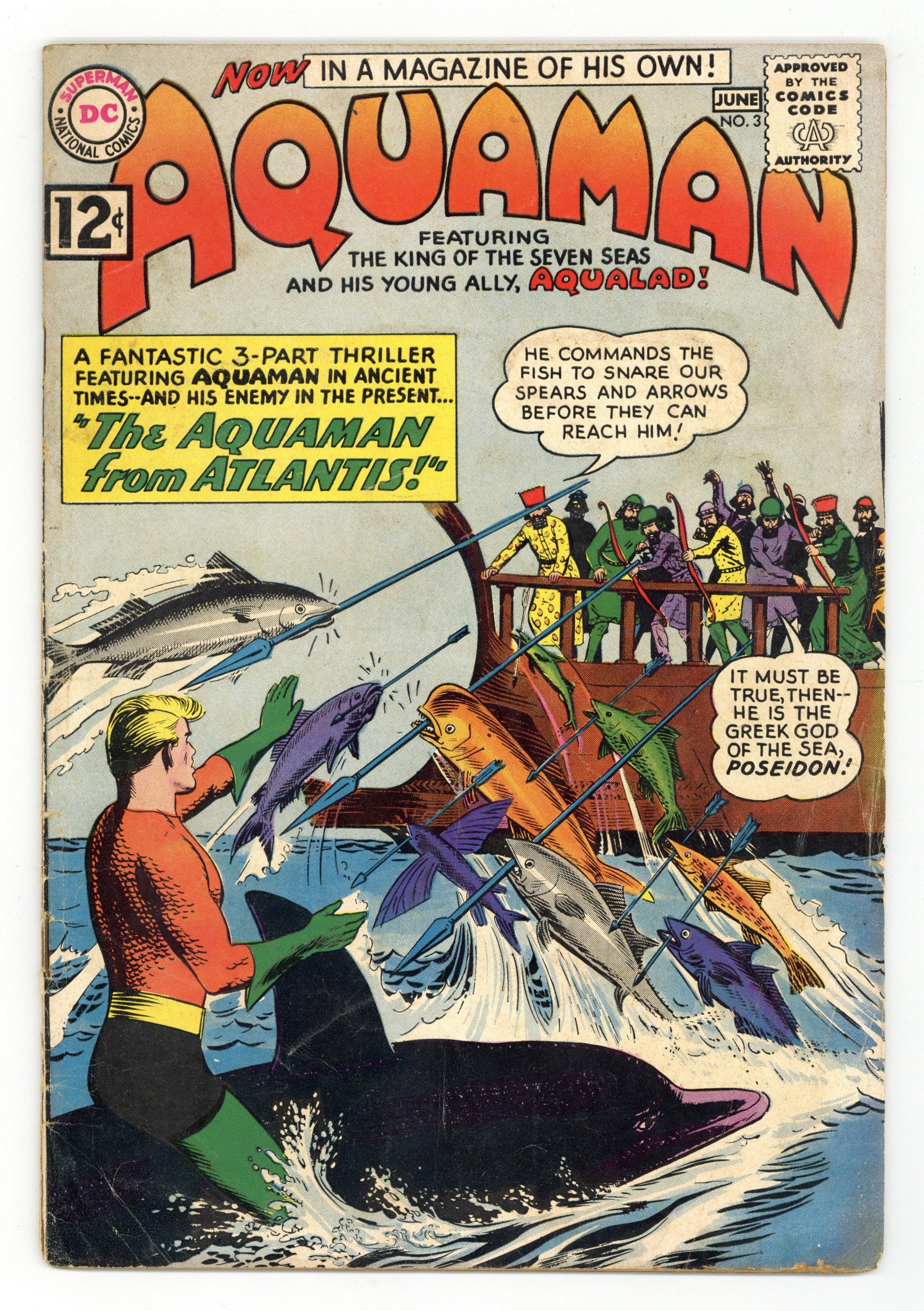 Cover art by Nick Cardy. The Aquaman From Atlantis, art by Nick Cardy; Aquaman and Aqualad investigate some strange explosions outside Atlantis; A renegade from Atlantis pushes Aquaman thru a time-warp and he ends up in ancient Greece. Facts About Our Oceans by Henry Boltinoff. Secret of the Shark article. 36 pgs. $0.12. Cover price $0.12.