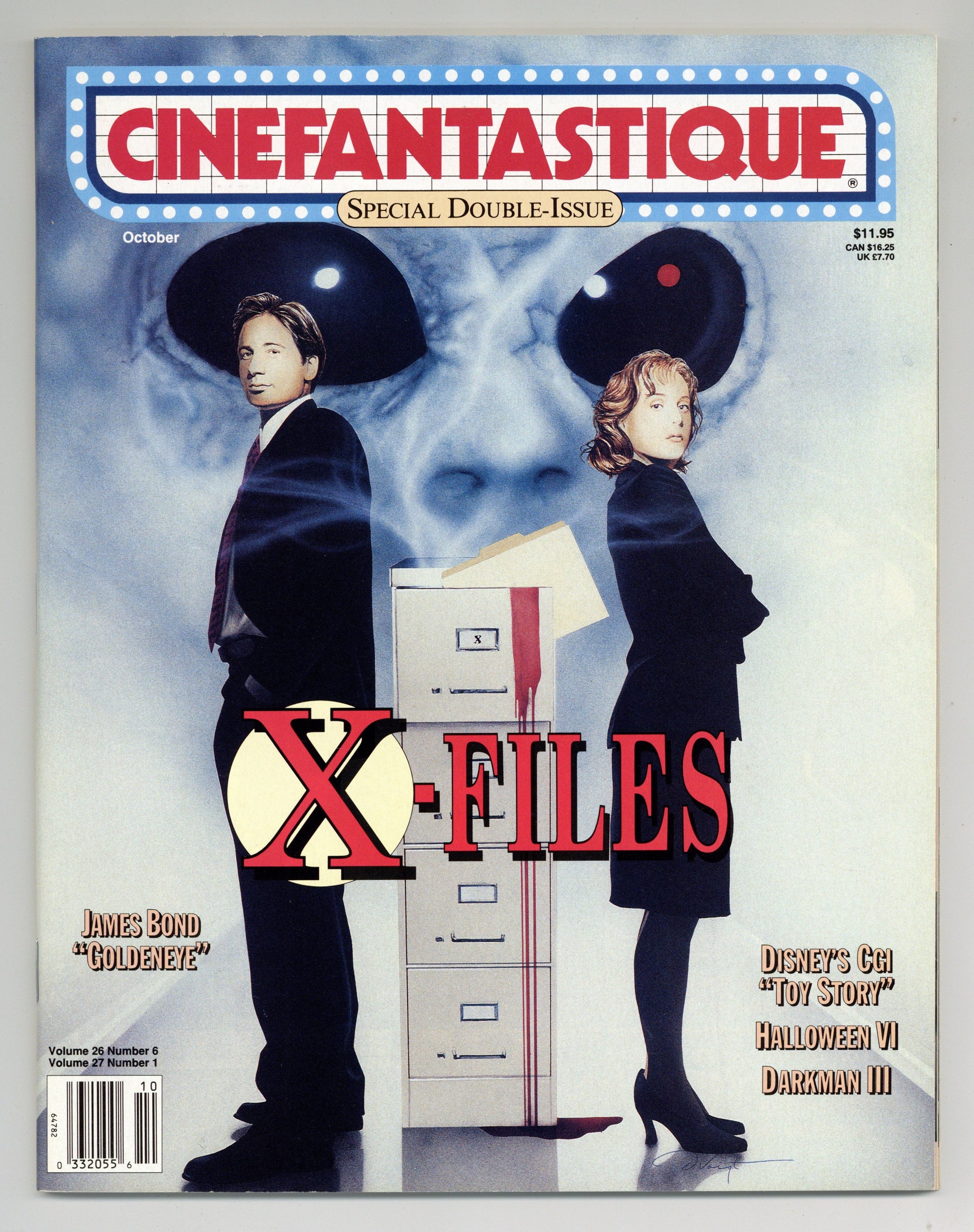 Double Issue: Vol 26, Num 6 AND Vol 27, Num 1. This special double issue includes the following: previews of Goldeneye, Toy Story, Halloween VI, Mind Ripper, Darkman III, and Death Machine; Disney artists on Pocahontas; the making of X-Files (with episode guide); an epitaph for Ren & Stimpy (with episode guide); and more. X-Files cover painting by David Voigt. Cover price $11.95.