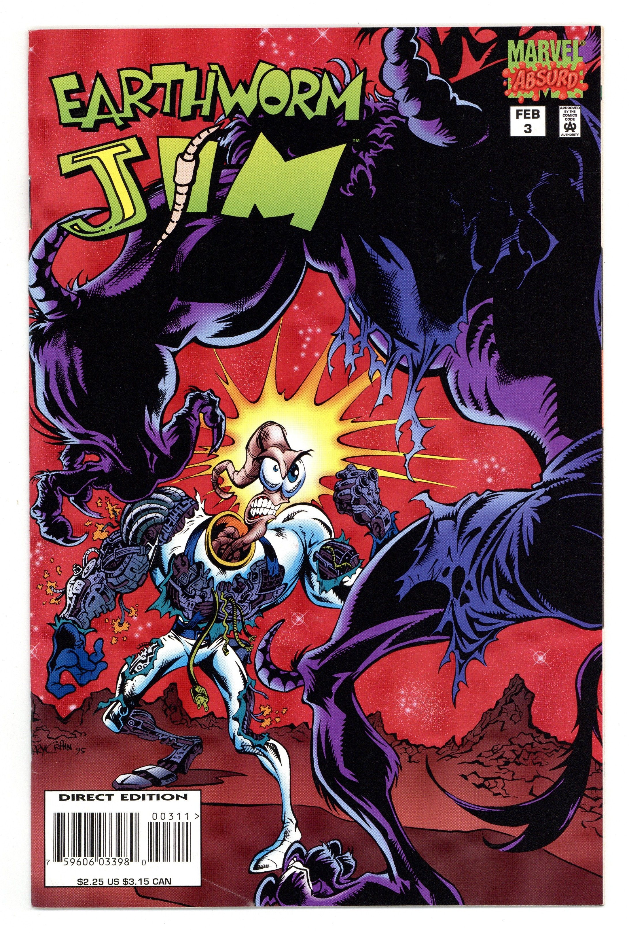 $38.00Direct Edition. The galaxy's grooviest invertebrate conquered the worlds of video games, toys, cartoons and cards--now he's got his own Marvel comic! In this climactic issue, our sassy segmented hero faces the most evil scourges of the universe--lawyers! Sue, Earthworm Jim, sue! Written by Dan Slott. Art by Barry Crain, Sam De La Rosa and Carlos Garzon. Cover by Barry Crain. Cover price $2.25.