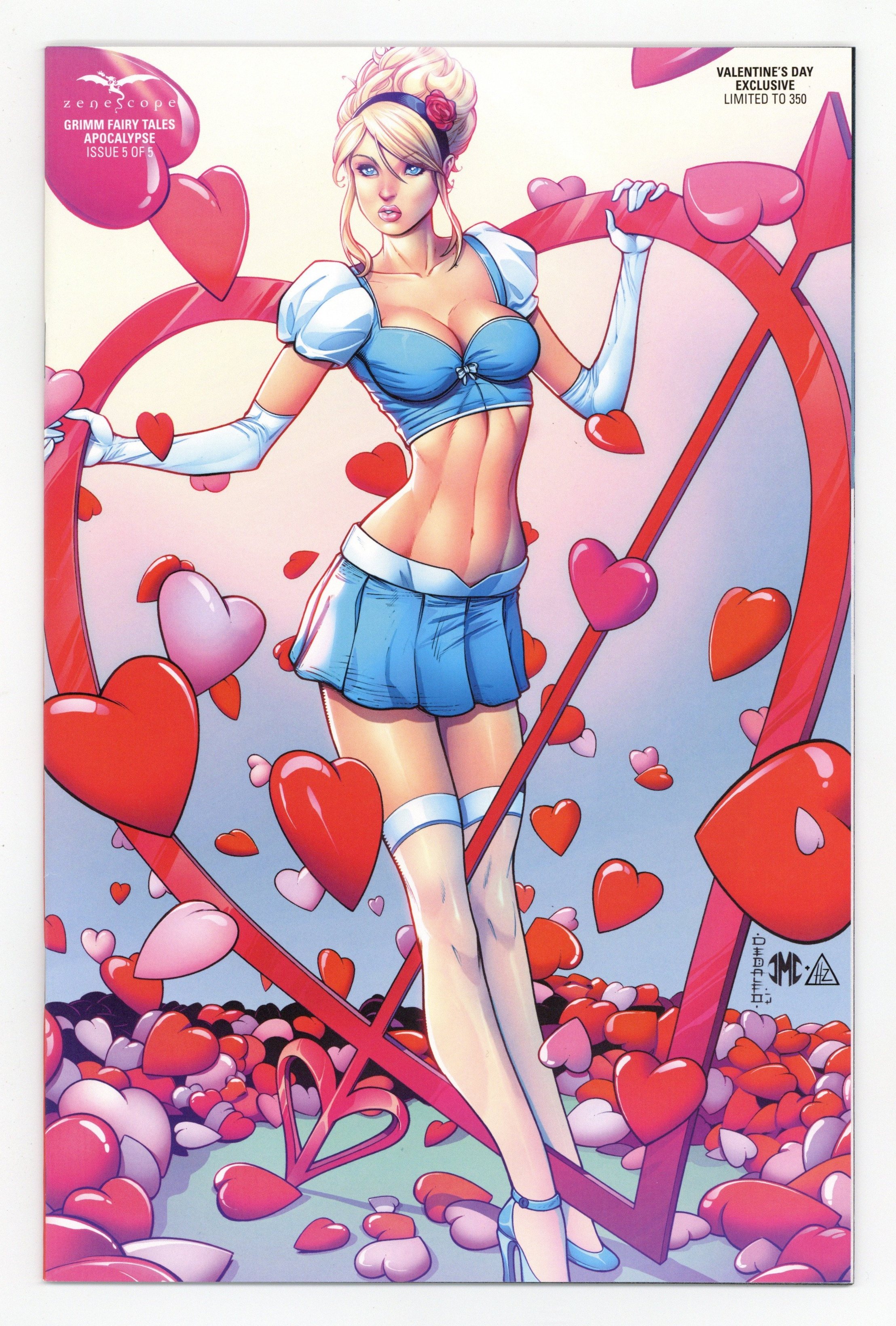 Valentine's Day Exclusive Variant Cover. Limited to 350 copies. Written by Patrick Shand. Art by JG Miranda. Cover by Mike DeBalfo and Jeremy Clark. Double-Sized Finale! Van Helsing fans - don't miss this issue. Don't miss the shocking conclusion of Zenescope's earth-shattering summer event. Robyn Hood, Hellchild, Van Helsing, Cindy, and Marian Quin face the consequences of their battle with the Four Horsemen, and not everyone will make it out of the Apocalypse alive. As a new day dawns on the Grimm Universe, the choices made by the heroes will define the future of the Earth and its surrounding realms. 48 pages, full color. Rated T