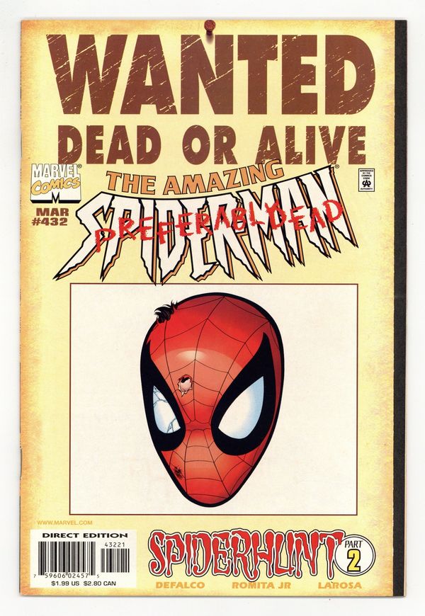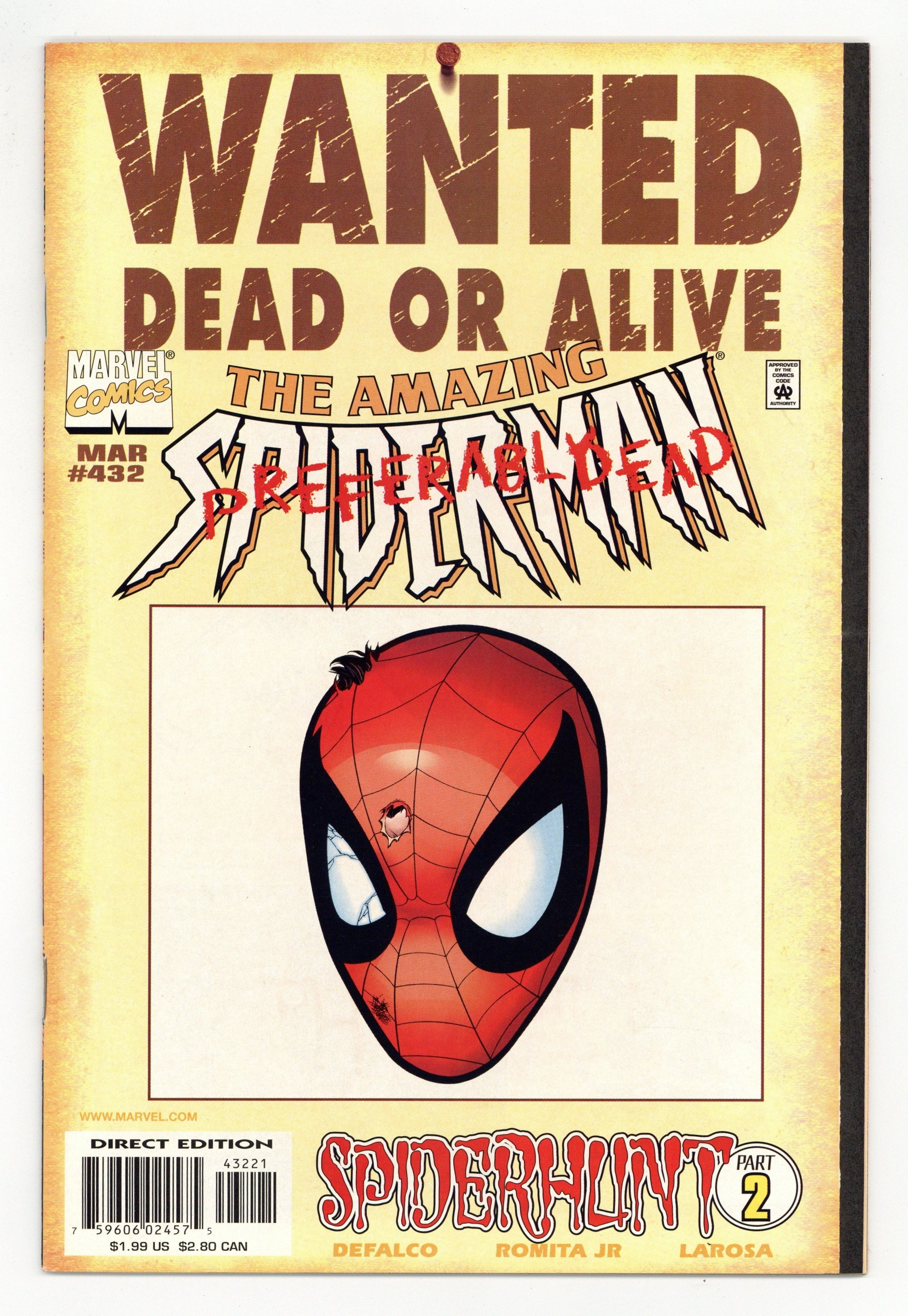 Tags: Marvel Legacy Numbering: Amazing Spider-Man (part 432), Spider-Hunt (part 2)$20.00"Wanted Dead or Alive" cover (This issue was released with two different covers). The Black Tarantula guest stars in Spiderhunt part 2, "The Hunted!", script by Tom DeFalco, pencils by John Romita Jr., inks by Bud LaRosa; Spider-Man has been framed for the death of a thug named Joey Z; (SM #88, '98) and the Daily Bugle has upped the bounty on his head to five million dollars; Spidey searches for Normie Osborn, kidnapped by the Green Goblin (SenSM #25, '98); Elsewhere, Black Tarantula requests permission to expand his operations to the city and Fortunato, spurning the Rose, welcomes him in exchange for killing Spidey; Meanwhile, Robbie finishes packing his things and leaves the Bugle; Spidey resumes his search for Normie when Tarantula attacks; Meanwhile, MJ parties with Shantal while Normie sits with the Goblin at a Brooklyn salvage yard, convinced he's with his father back from the dead. Shotgun cameo. The story continues in Peter Parker 89. 38 pgs., full color. $1.99. Cover price $1.99.