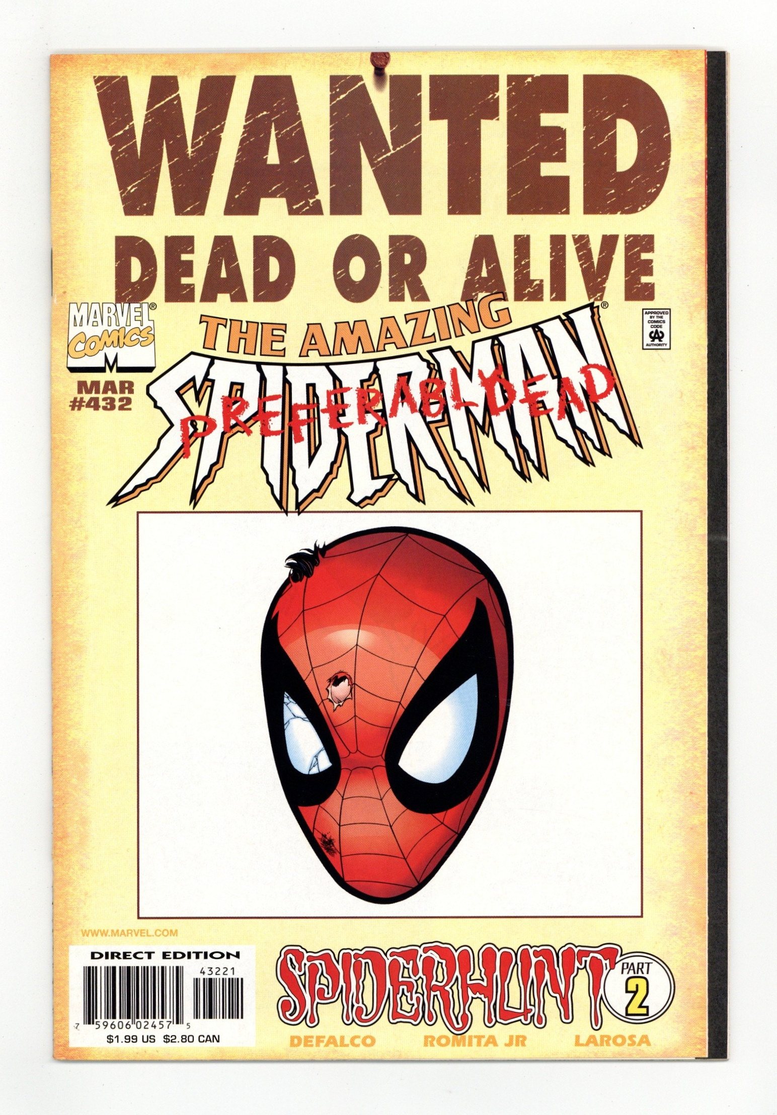 Tags: Marvel Legacy Numbering: Amazing Spider-Man (part 432), Spider-Hunt (part 2)$21.50"Wanted Dead or Alive" cover (This issue was released with two different covers). The Black Tarantula guest stars in Spiderhunt part 2, "The Hunted!", script by Tom DeFalco, pencils by John Romita Jr., inks by Bud LaRosa; Spider-Man has been framed for the death of a thug named Joey Z; (SM #88, '98) and the Daily Bugle has upped the bounty on his head to five million dollars; Spidey searches for Normie Osborn, kidnapped by the Green Goblin (SenSM #25, '98); Elsewhere, Black Tarantula requests permission to expand his operations to the city and Fortunato, spurning the Rose, welcomes him in exchange for killing Spidey; Meanwhile, Robbie finishes packing his things and leaves the Bugle; Spidey resumes his search for Normie when Tarantula attacks; Meanwhile, MJ parties with Shantal while Normie sits with the Goblin at a Brooklyn salvage yard, convinced he's with his father back from the dead. Shotgun cameo. The story continues in Peter Parker 89. 38 pgs., full color. $1.99. Cover price $1.99.