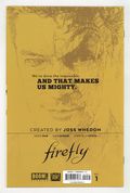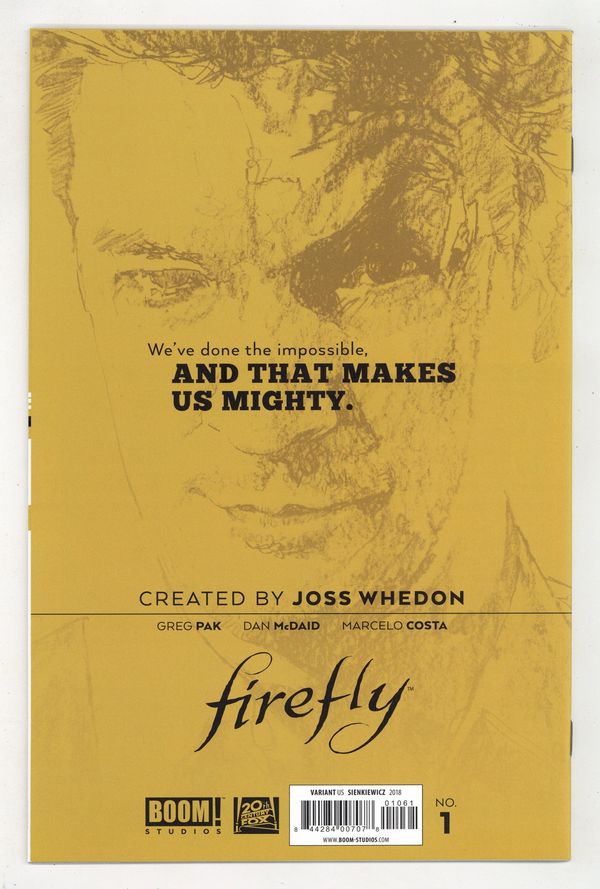 Published Nov 2018 by Boom Studios.$45.00Limited 1 for 100 Retailer Incentive Variant Cover. Written by Greg Pak. Art by Dan McDaid. Cover by Bill Sienkiewicz. BOOM! Studios, along with visionary writer and director Joss Whedon (Buffy the Vampire Slayer, The Avengers), presents an all-new era of the pop culture phenomenon Firefly , as one of the most demanded stories in the franchise's history is revealed for the first time! Captain Malcolm 'Mal' Reynolds, a defeated soldier who opposed the unification of the planets by the totalitarian governed Alliance, will undertake any job-legal or not-to stay afloat and keep his crew fed. Find out now how his story began as BOOM! Studios delves into Mal's past, how he met his first mate Zoe and the real truth about the War of Unification.the intergalactic civil war that divided friend and family alike. Focusing on family, loyalty, identity, and the price of redemption, writer Greg Pak (Mech Cadet Yu, Totally Awesome Hulk) and artist Dan McDaid (Judge Dredd: Mega City Zero) take you back to the battleground where Mal's journey began. 32 pages, full color. Cover price $3.99.