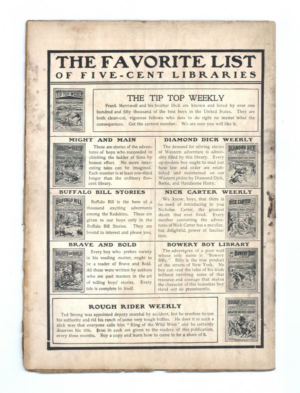 Published Aug 1906 by Street & Smith.$2.65- Cover Detached. Water damage: Extensive. Staple rust: Extensive.