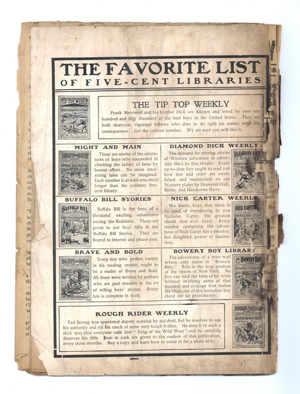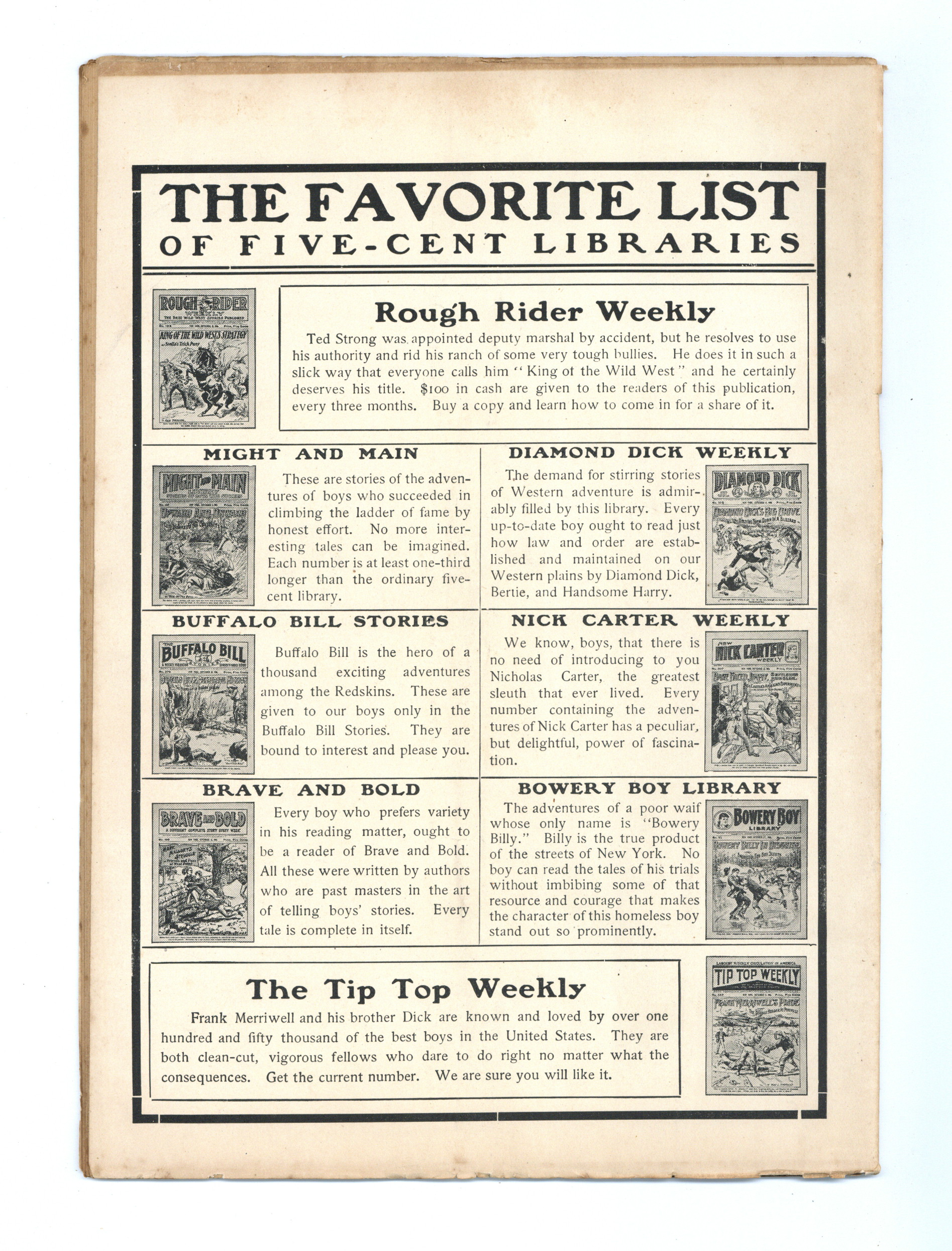 Published Dec 1906 by Street & Smith.$2.65- Spine split 90%. Cover Detached. Water damage: Extensive. Staple rust: Extensive.
