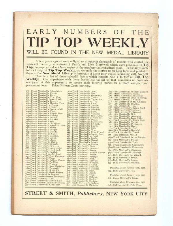 Published Feb 1911 by Street & Smith.$10.00- Spine split 40%. Staple rust: Slight.