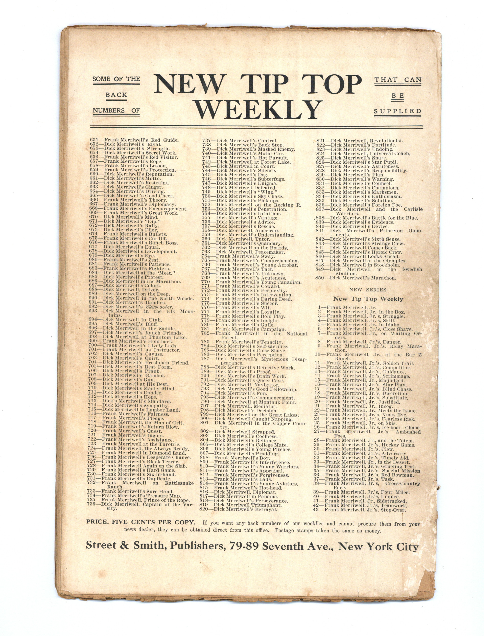 June 14, 1913. Frank Merriwell Junior's Outfielder. 8 1/4" x 10 1/2", 32 pages. Cover price $0.05.
