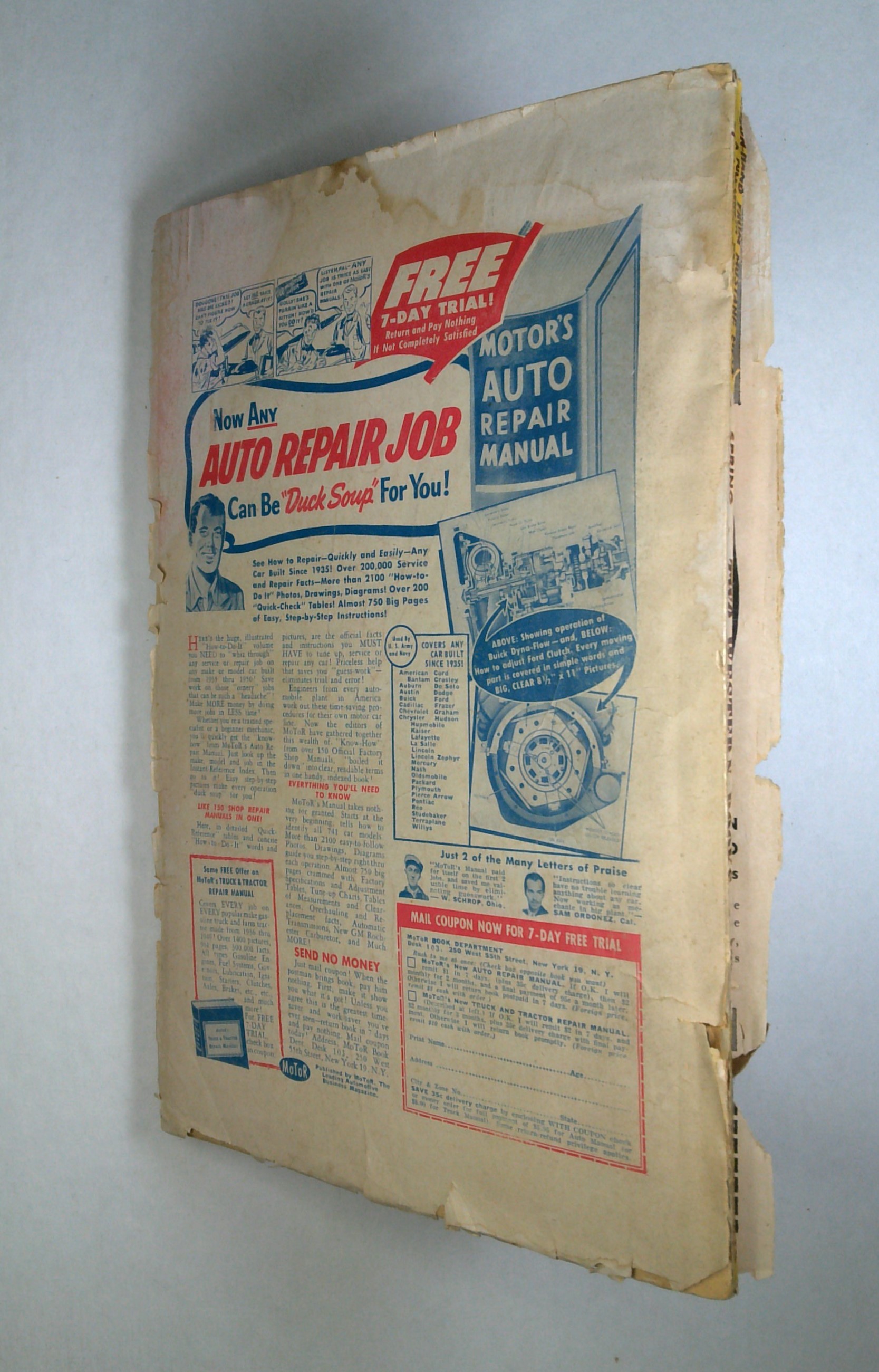- Back cover detached 25%. Front Cover Detached. Water damage: Moderate. Staple rust: Moderate.