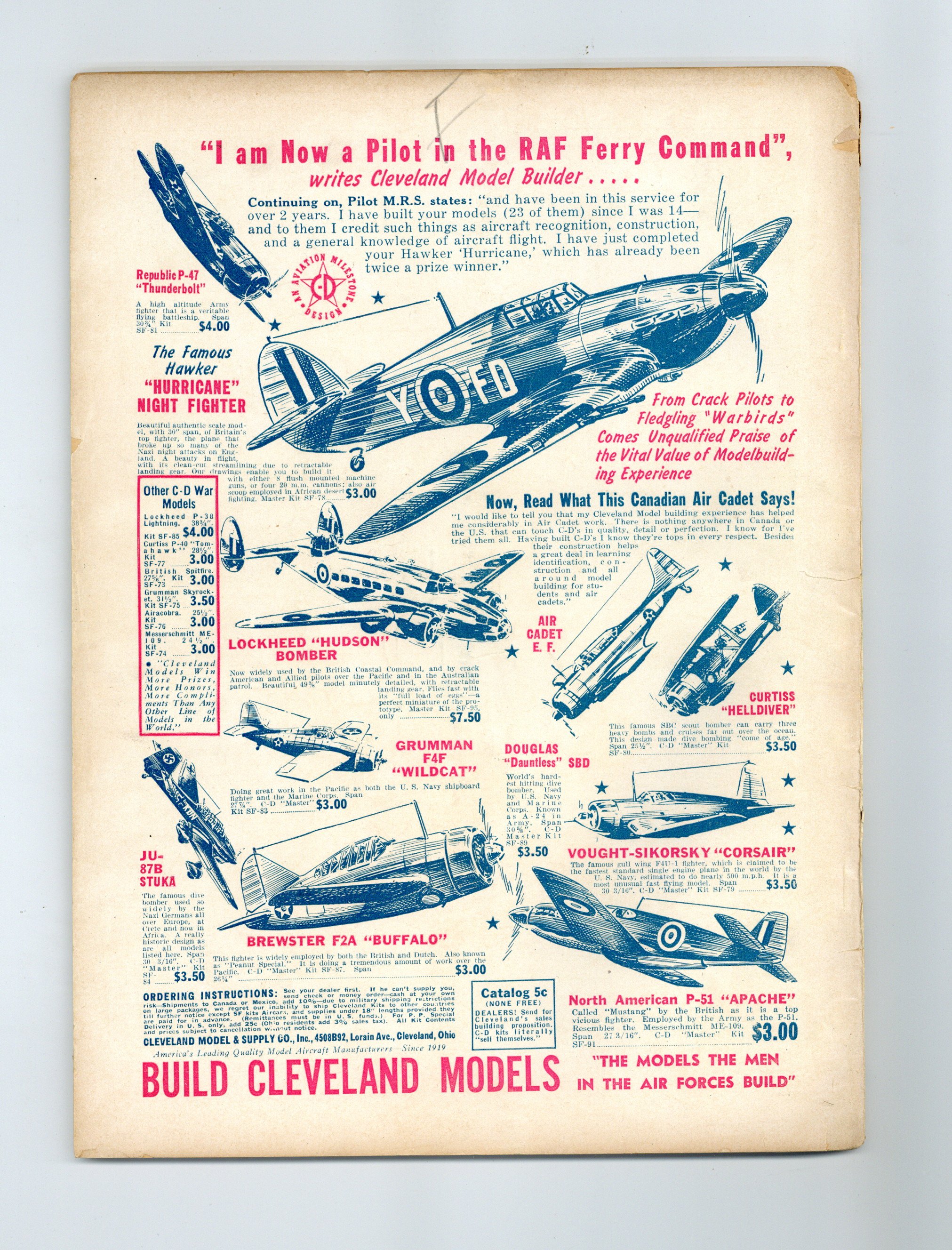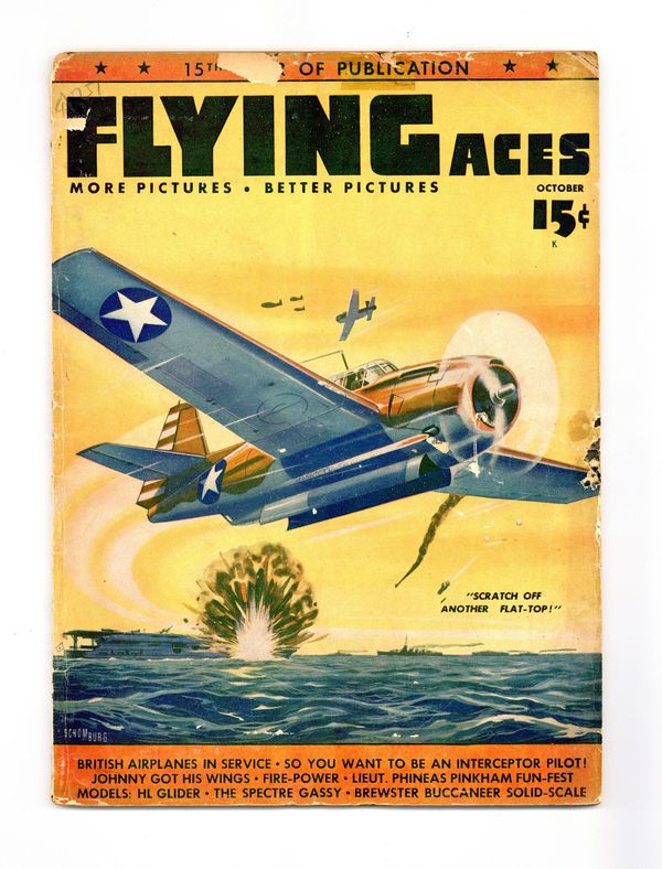 Volume 42 Issue #3 - Oct. 1942. Fiction, model-making articles, schematics, cartoons and factual essays make up every issue of Flying Aces. Cover by Alex Schomburg. Interior art by Al McWilliams. "Glider-Than-Air" by Joe Archibald story. "Russian Ramming Technique" by Frank Putnam, "Fire-power" pictorial of different aircraft firing tracers at night, Carrier pictorial, Battle of Midway examined and more. Bedsheet format 8 1/2-in. x 11 1/2-in., 72 pages, black and white. Cover price $0.15.
