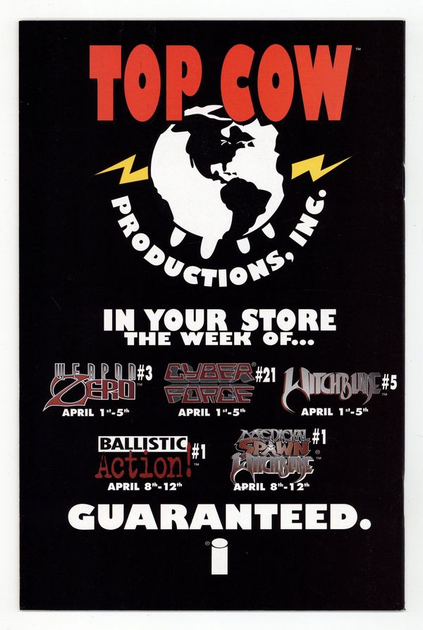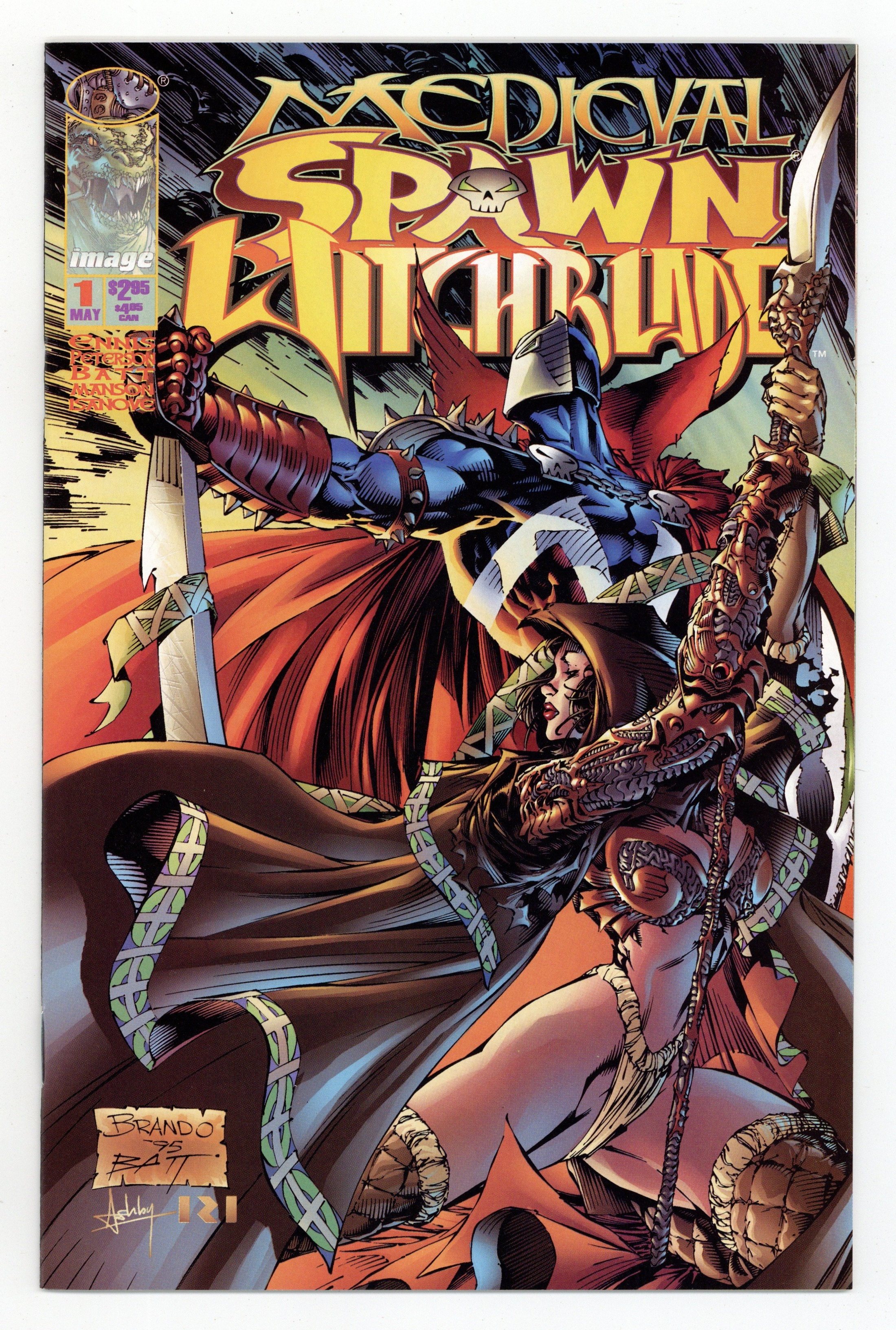 Direct Edition. Written by Garth Ennis. Art and cover by Brandon Peterson and BATT. Throughout history, there have been many remarkable women chosen to bear the powerful Witchblade. Now, in the first cross-over with Medieval Spawn, fans will learn of one such woman. Discover the romantic link between these two powerful beings, and the key they hold to the present day Spawn and Witchblade. FC, 32 pg. Cover price $2.95.