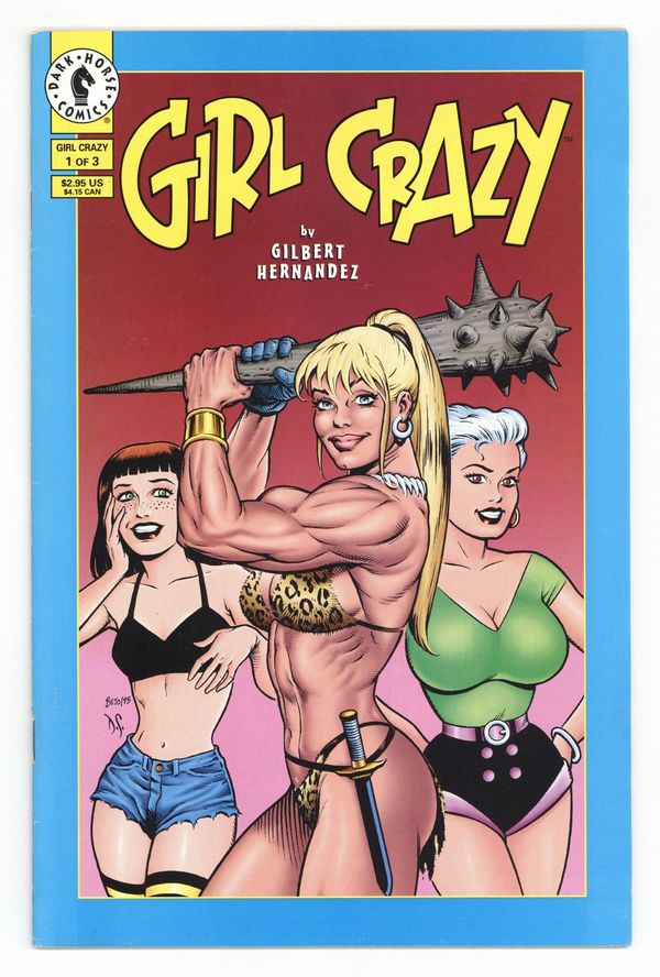 Published May 1996 by Dark Horse.$6.80Story and art by Gilbert Hernandez. Cover by Gilbert Hernandez and Dave Stevens. Kitten, Maribel, and Gaby are three very different girls with one single purpose -- break their pal Una out of her Tijuana prison cell! With the super-powered guards pulling overtime, that's no easy feat. But if the job can be pulled off, this is the trio that'll do it. Kitten can crush the most fearsome robots with her atomic eyebeams; Maribel is the queen of the savage Hollywood jungles; and Gaby . . . well, not even a 1950 Caddy can bowl over Gaby. So it's off to Tijuana in Gilbert Hernandez's Girl Crazy. 32 pages, B&W. Cover price $2.95.