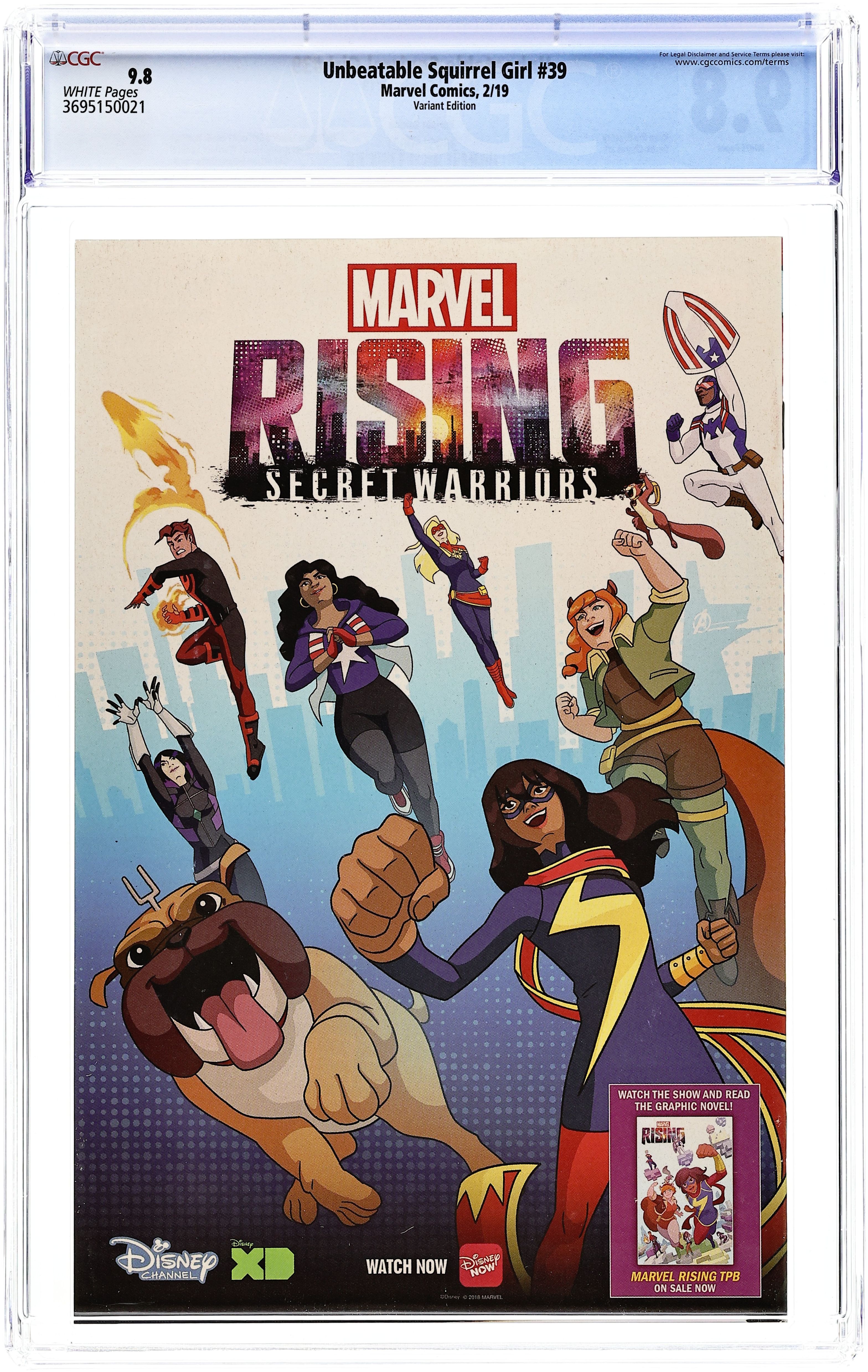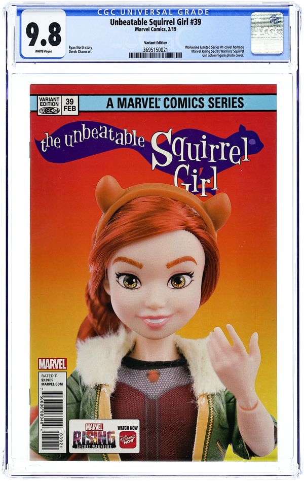 Written by Ryan North. Art by Derek Charm. Marvel Rising Action Doll Homage Variant Cover. Last issue ended with Squirrel Girl and someone CLAIMING to be Iron Man getting into a fight! Will this issue show you how that fight goes and who wins and why? THE ANSWER: yes! But with an Iron Man imposter on the scene, that means the real Tony Stark is missing! It's up to Squirrel Girl and her friends to find Tony before it's too late: for him AND the world. Unfortunately for Squirrel Girl-as this comic is within the super-hero genre of sequential art, one that relies on high-stakes narrative storytelling filled with twists and turns that result in the world never being the same-what she finds is not what she expects and the world will never be the same! All this-plus: let's say underwater adventure too awaits you in this issue of the Unbeatable Squirrel Girl! 28 pages, full color. Rated T+ Cover price $3.99.