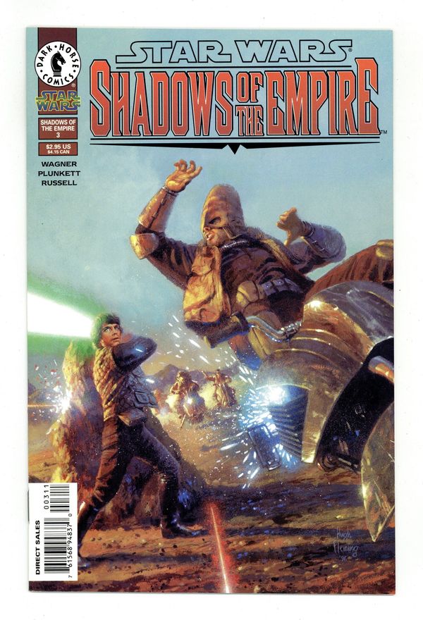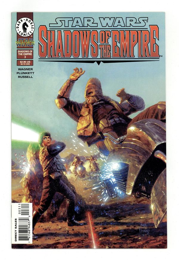 Tags: Star WarsPublished Jul 1996 by Dark Horse.$21.00Written by John Wagner. Art by Kilian Plunkett and P. Craig Russell. Cover by Hugh Fleming. They outnumber him and outgun him. By all rights, Luke Skywalker should be one dead Jedi-in-training, the target of a surprise attack by Jabba's swoop gang. But he's not . . . and even he isn't certain of the reason! 32 pages, FC. Cover price $2.95.
