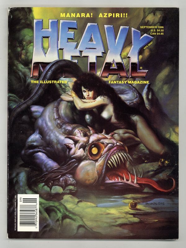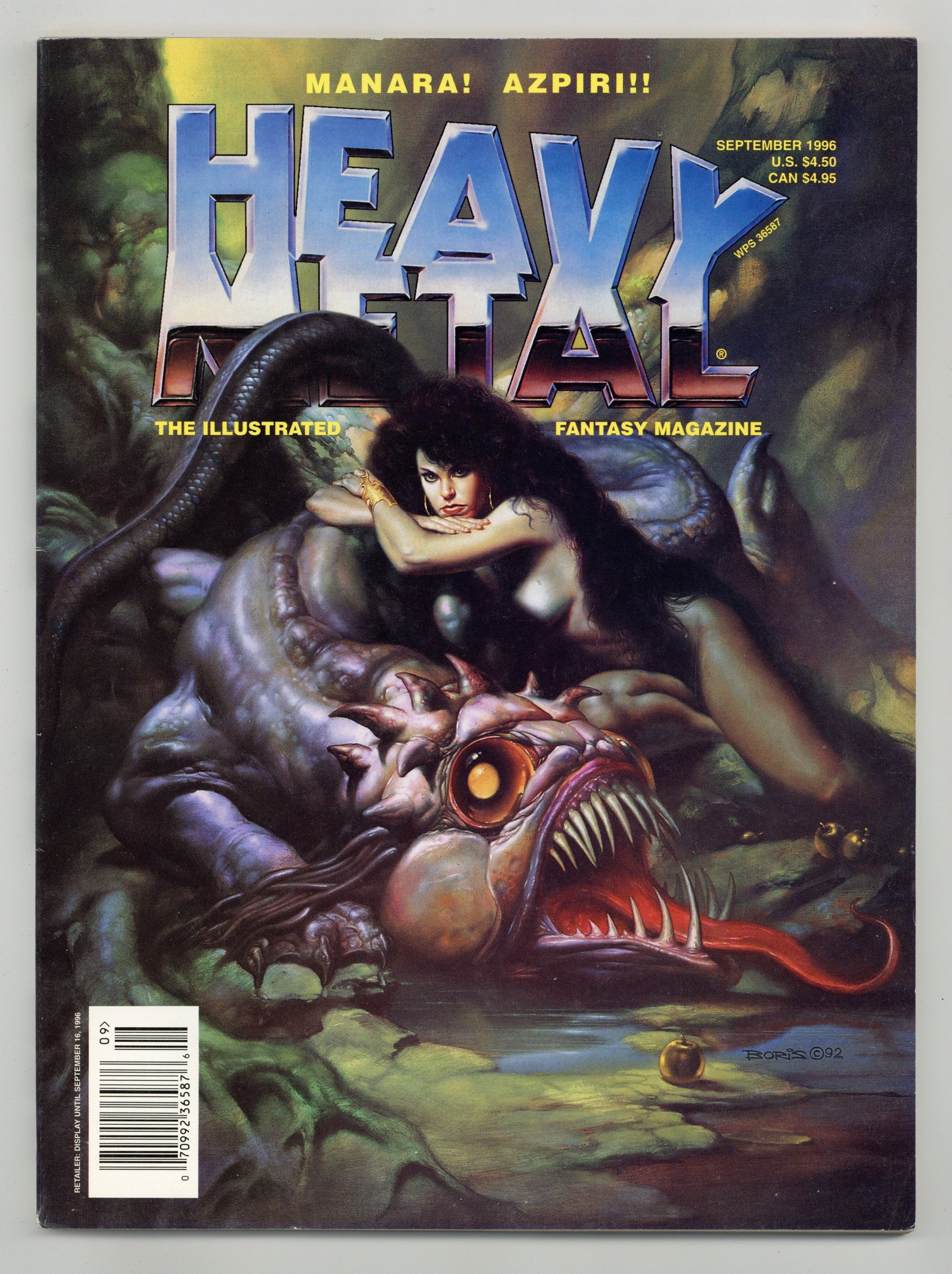 Vallejo cover, Manara, Azpiri, September, 1996, issue 165. Dubbed "The adult illustrated fantasy magazine," Heavy Metal also publishes tales of horror, science fiction, and adventure. This issue includes the following stories: Museum by Fernando de Felipe; Raul Fulgurex in the Mutineers are Revolting by Tronchet and Gelli; On the Road Again-Calypso Rock by Baru; No Man's Land by Lorenzo Diaz and Carlos Puerta; Towards a New Beginning by Azpiri; Park Charles-Chimera by Barriero and Risso; and Rasputin by Manara. Includes Manara art gallery. Cover art by Boris Vallejo. Cover price $4.50.