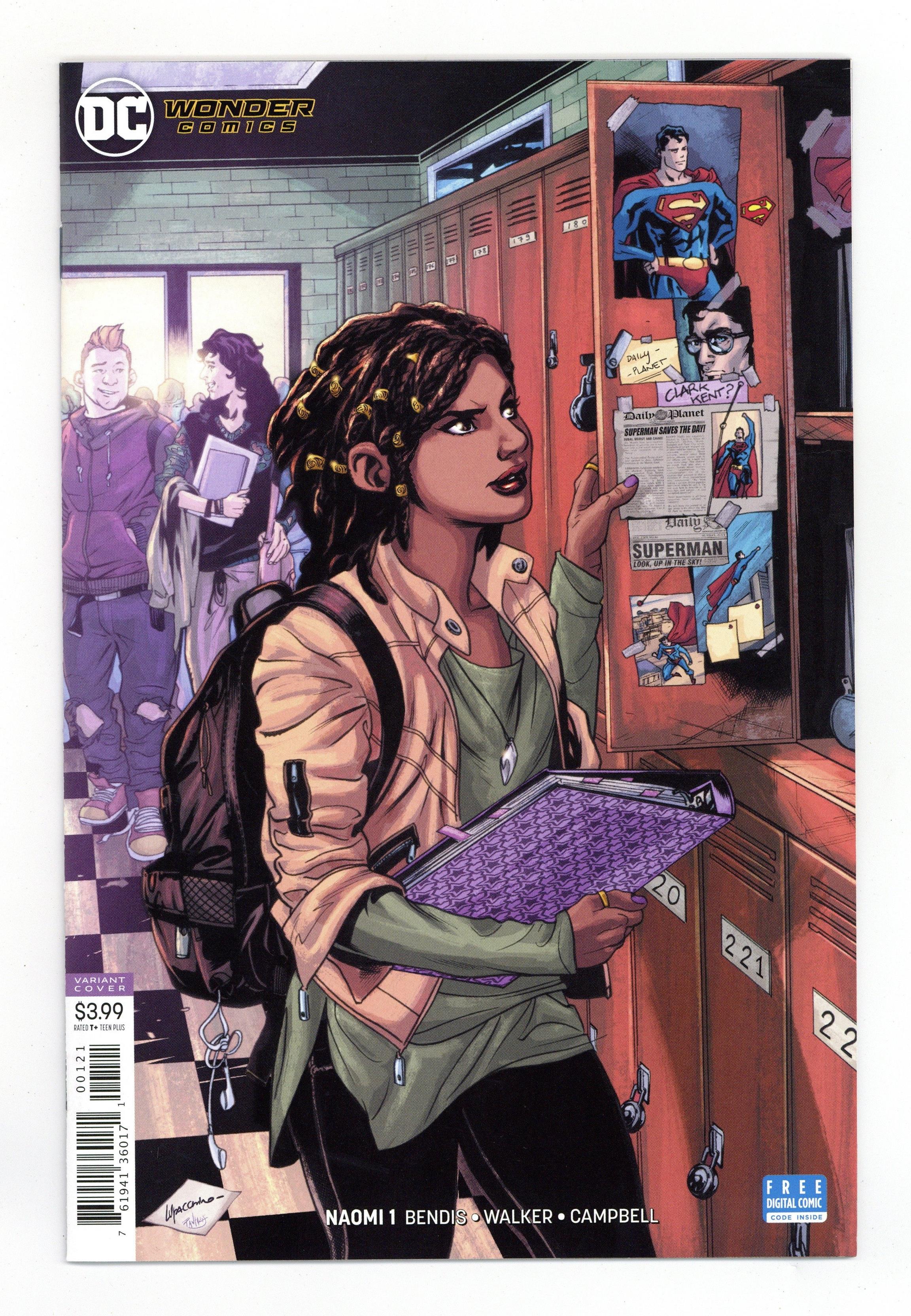 Written by David F. Walker and Brian Michael Bendis. Art by Jamal Campbell. Cover by Emanuela Lupacchino. DC's biggest, newest mystery starts here! When a fight between Superman and Mongul crashes into a small Northwestern town, Naomi (last name?) begins a quest to uncover the last time a super-powered person visited her home-and how that might tie into her own origins and adoption. Follow Naomi's journey on a quest that will take her to the heart of the DC Universe and unfold a universe of ideas and stories that have never been seen before. Join writers Brian Michael Bendis, David Walker and breakout artist Jamal Campbell in Wonder Comics' massively ambitious new series and star... NAOMI. 32 pages, full color. Rated T+ Cover price $3.99.