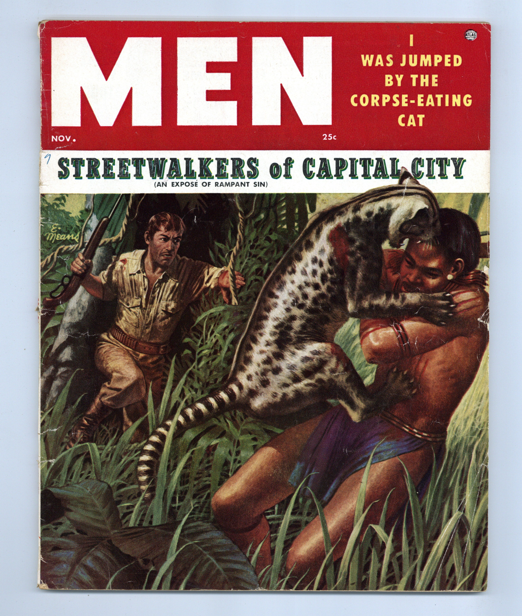 Volume 4, Issue 11 - November 1955. Cover by Elliot Means. Men's magazine featuring articles on hunting, fitness, politics, true crime, and buxom beauties. 8 1/2-in. x 11-in. 82 pages B&W. Cover price $0.25.