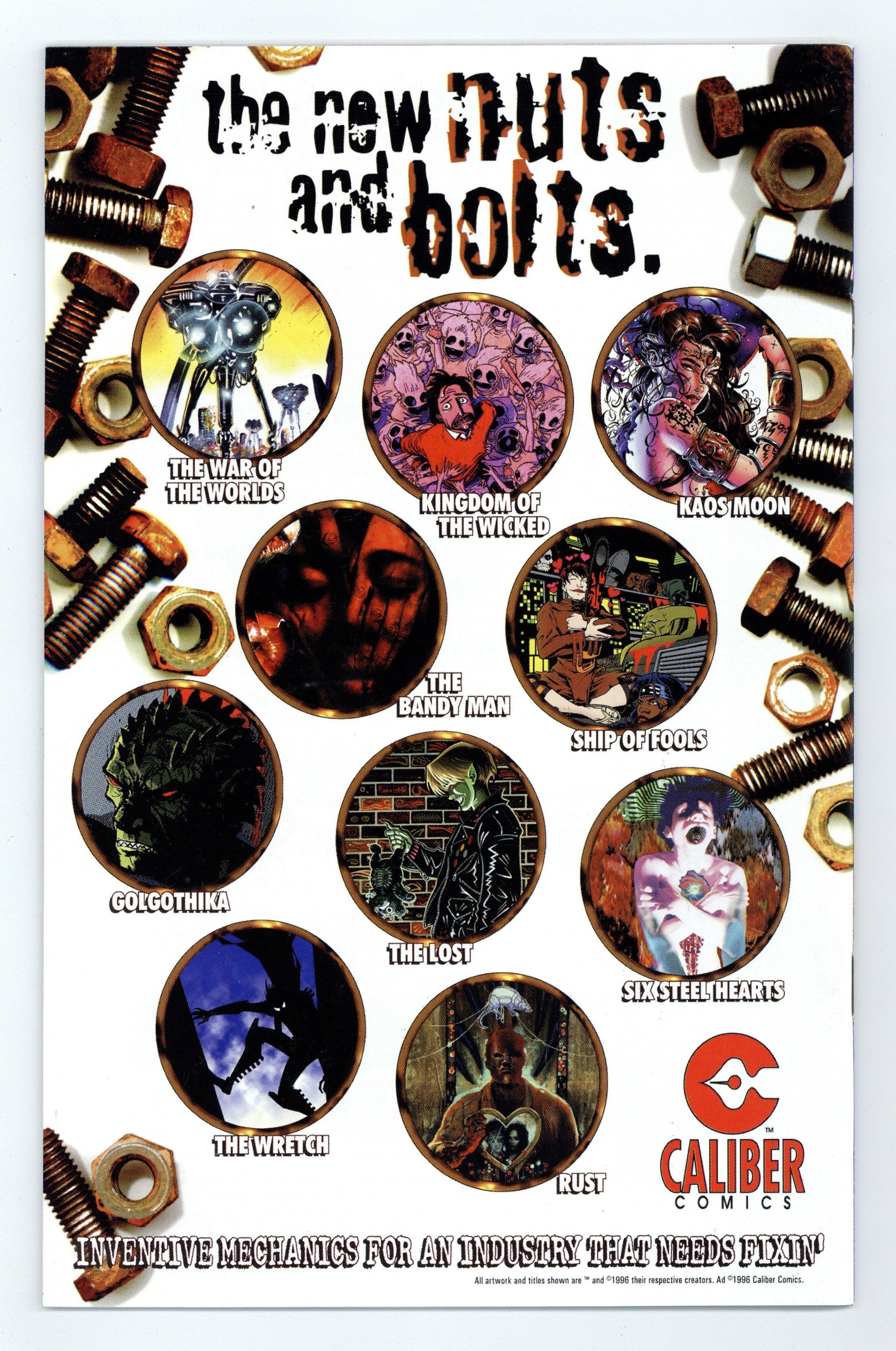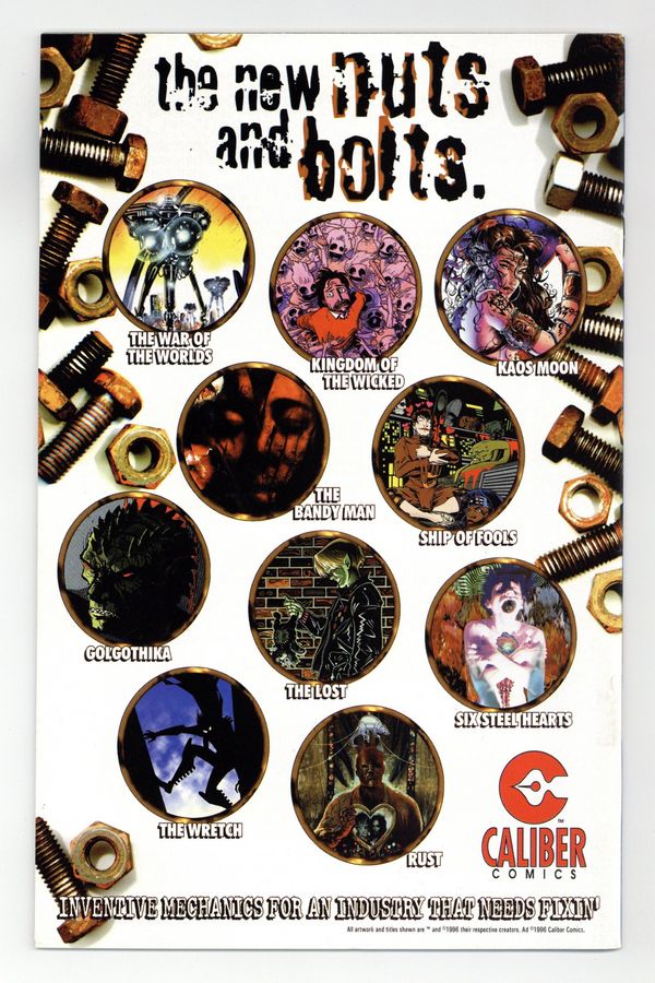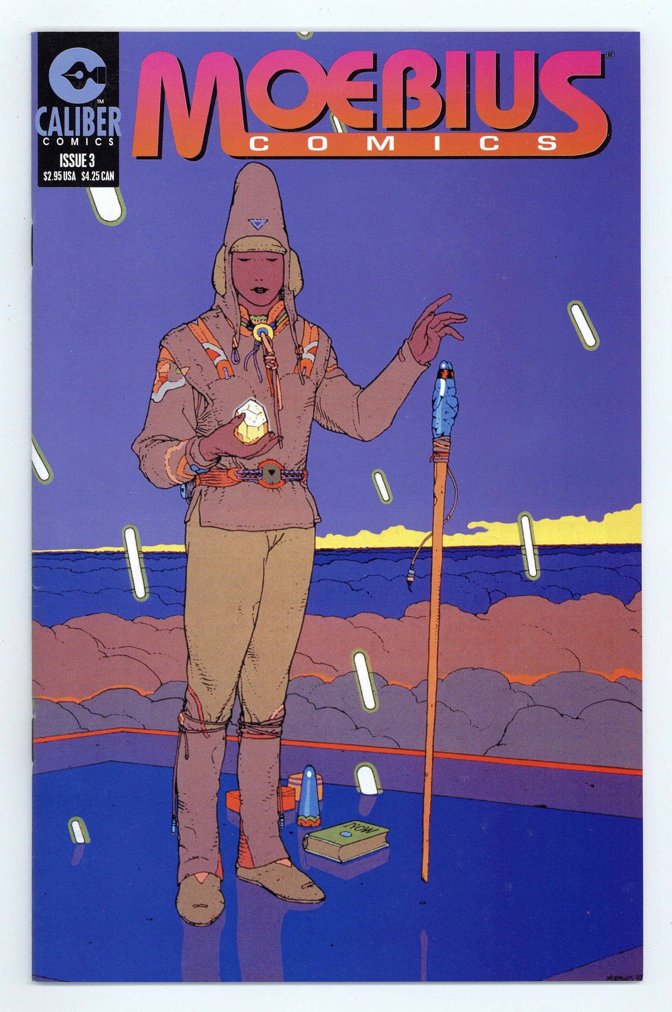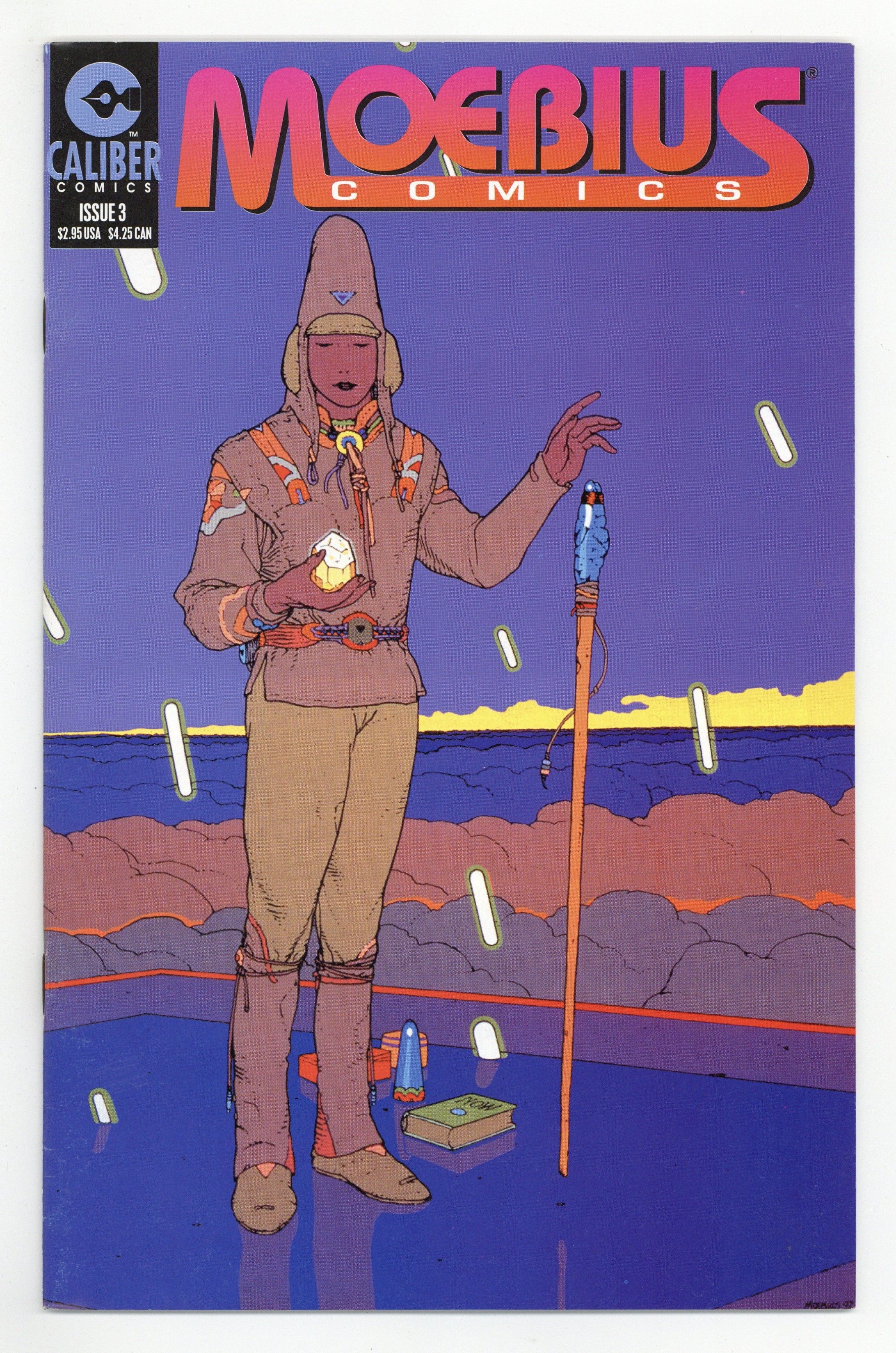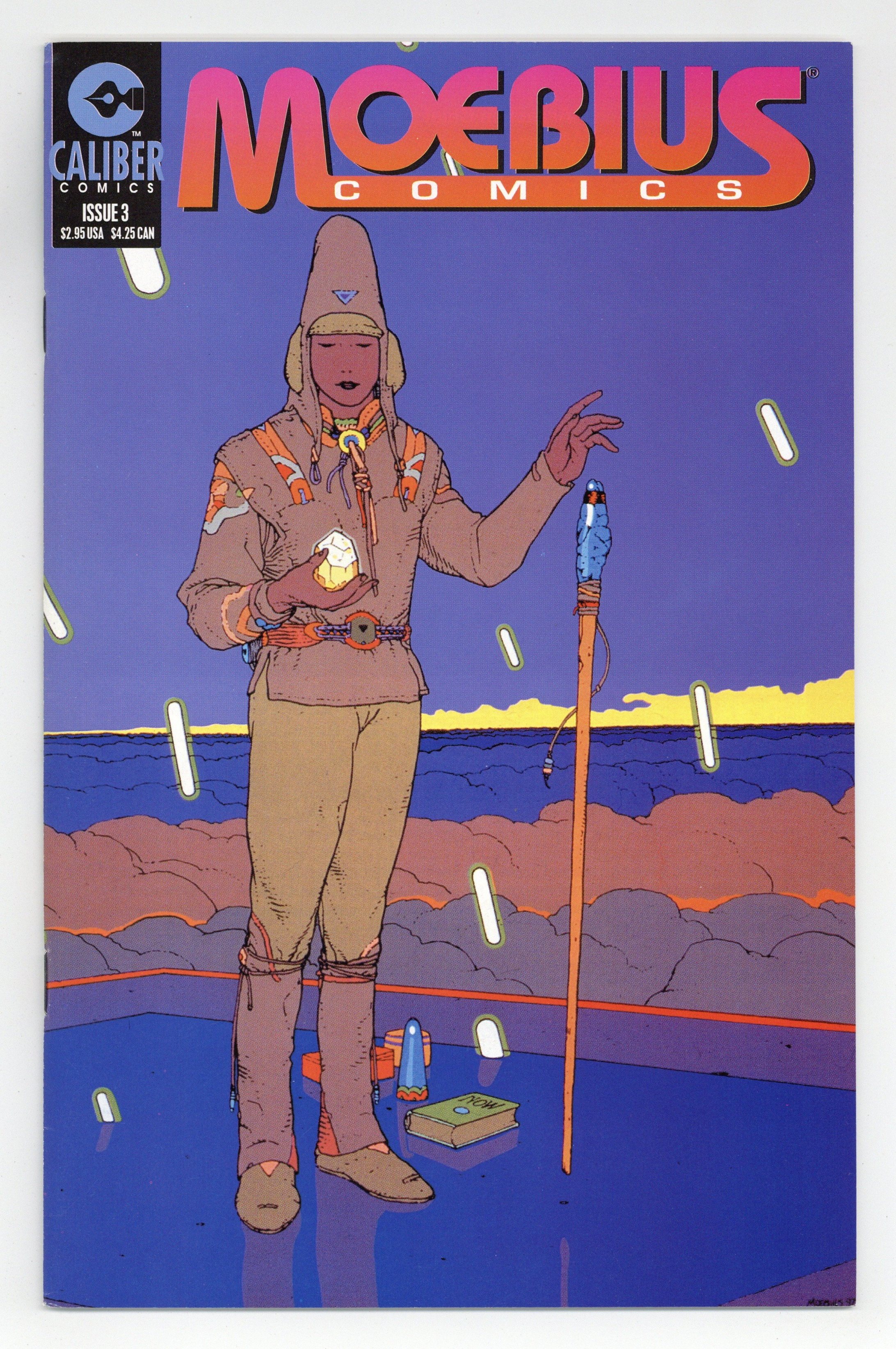 Stories by Moebius, Guy Hempray, Dave Taylor, Jean-Marc Lofficier and Randy Lofficier. Art by Moebius and Dave Taylor. Cover by Moebius. Caliber presents classic stories and little-known tales by legendary French cartoonist Jean Giraud, better known as Moebius. The mind-bending Man from Ciguri saga; also an early Moebius story from 1957, A City on Water. 32 pages, B&W. Mature readers. Cover price $2.95.