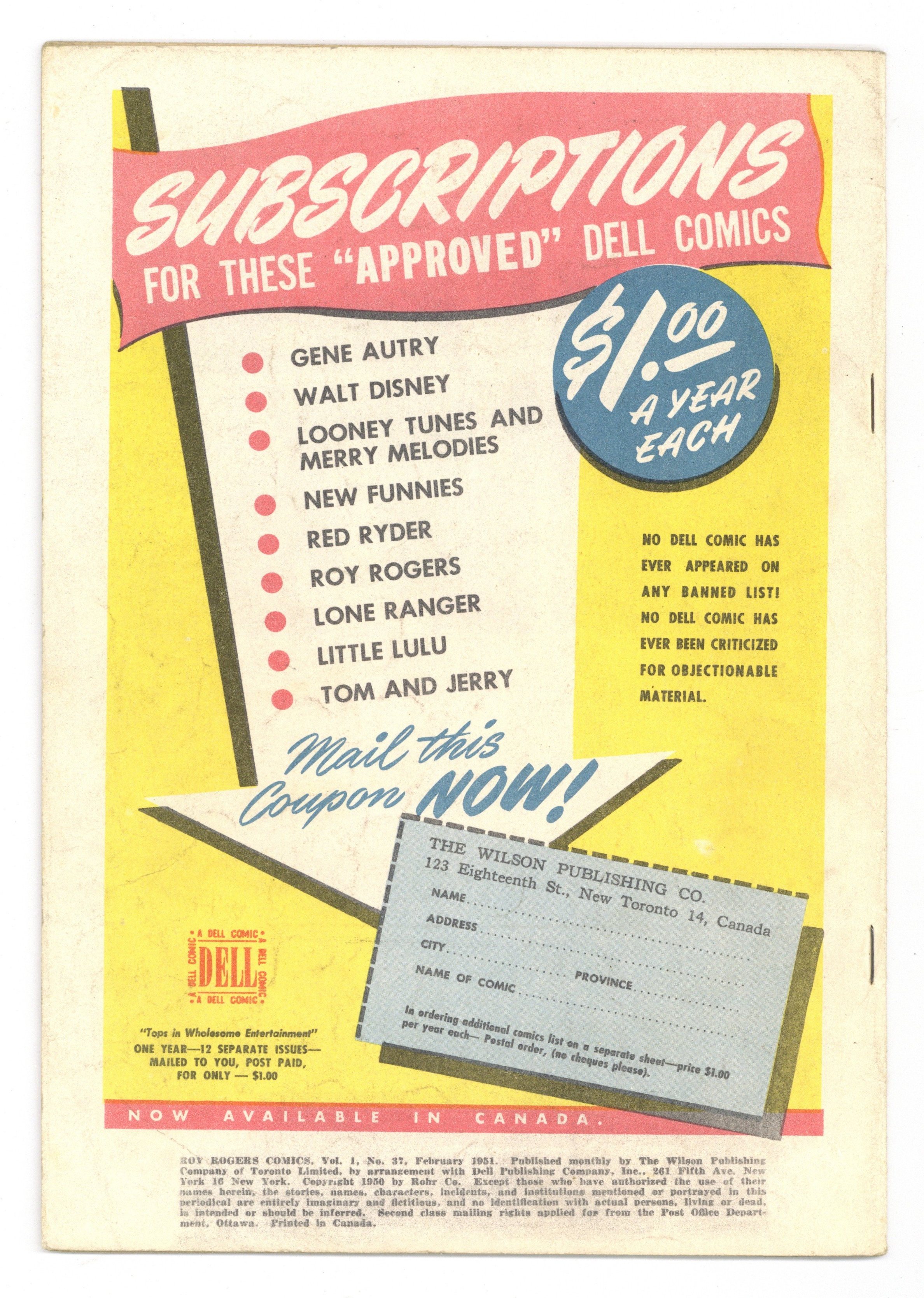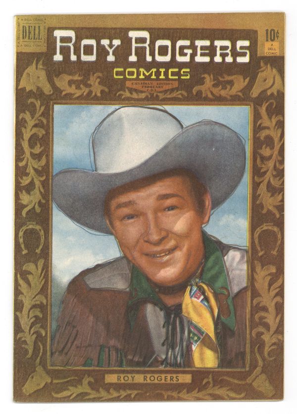 Canadian Edition. Photo cover of the famous singing cowboy, plus interior photos. Broken Boundaries starring Roy Rogers, art by Albert Micale; Diana Markham's hired gunmen shoot on sight anyone crossing her fence line. The Trade Rat's Treasure starring Roy Rogers, art by the Al McKimson team; Roy enters a spooky old farmhouse and finds a girl hiding there, looking for her grandpa's hidden gold. Pioneers of the Old West text story, art by Albert Micale. The Railroad Scooter starring Trigger, art by Harry Parkhurst. 52 pgs. $0.10. Cover price $0.10.