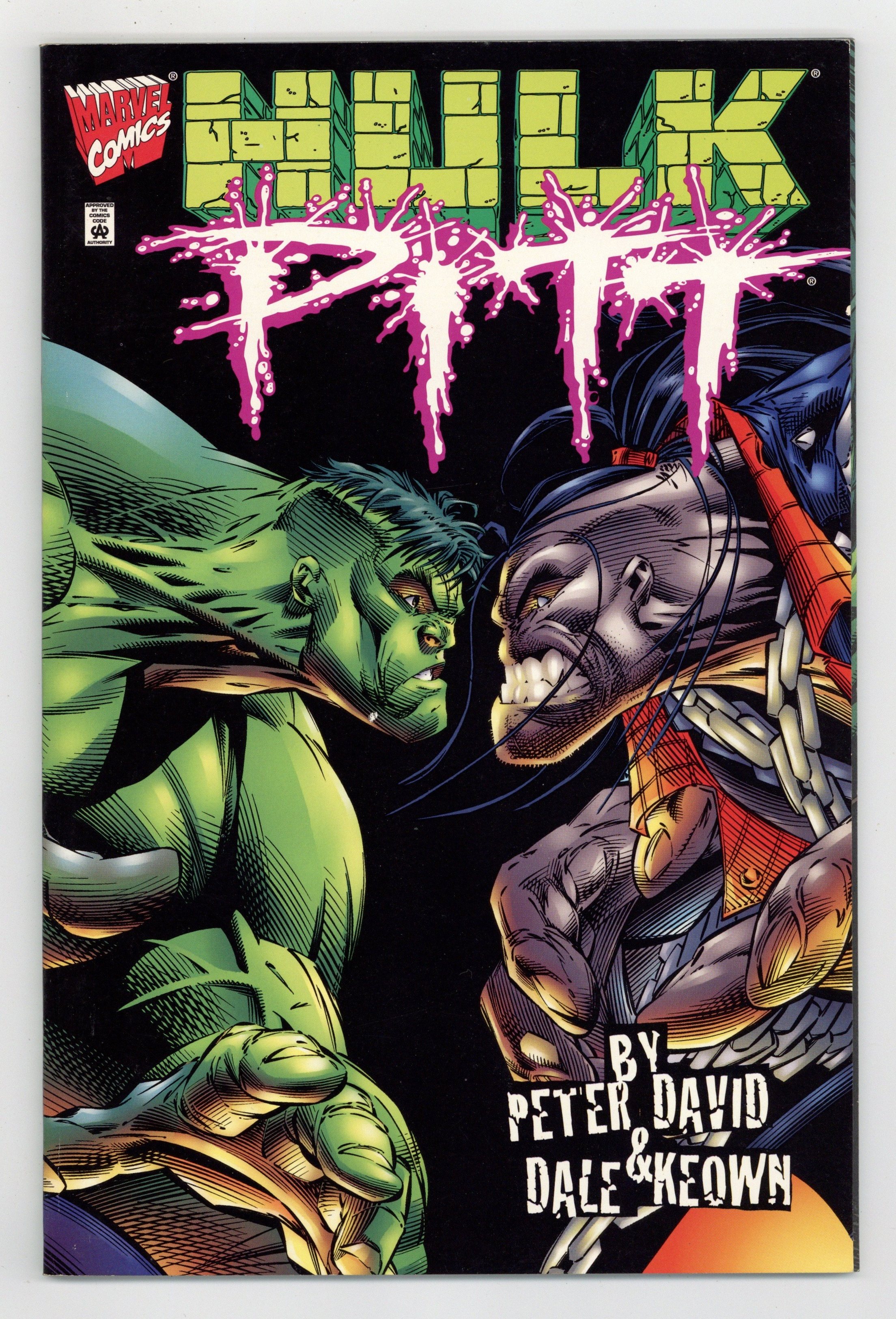 Tags: Hulk$21.00It's the Green Goliath vs. the Gray Gargantuan! Ladies and gentlemen and children of all ages...are you ready to rumble?! In this corner, guided to the ring by Rick Jones, wearing the torn purple trousers, the gamma-spawned giant men call the Hulk! In the opposing corner, led by a boy named Timmy, clad in the leather and chains, the alien atrocity known as Pitt! In this long-awaited 48-page bookshelf, it's the ultimate battle of the titans, brought to you by the classic Incredible Hulk team! Written by Peter David. Art by Dale Keown and Dan Panosian. Cover price $5.99.
