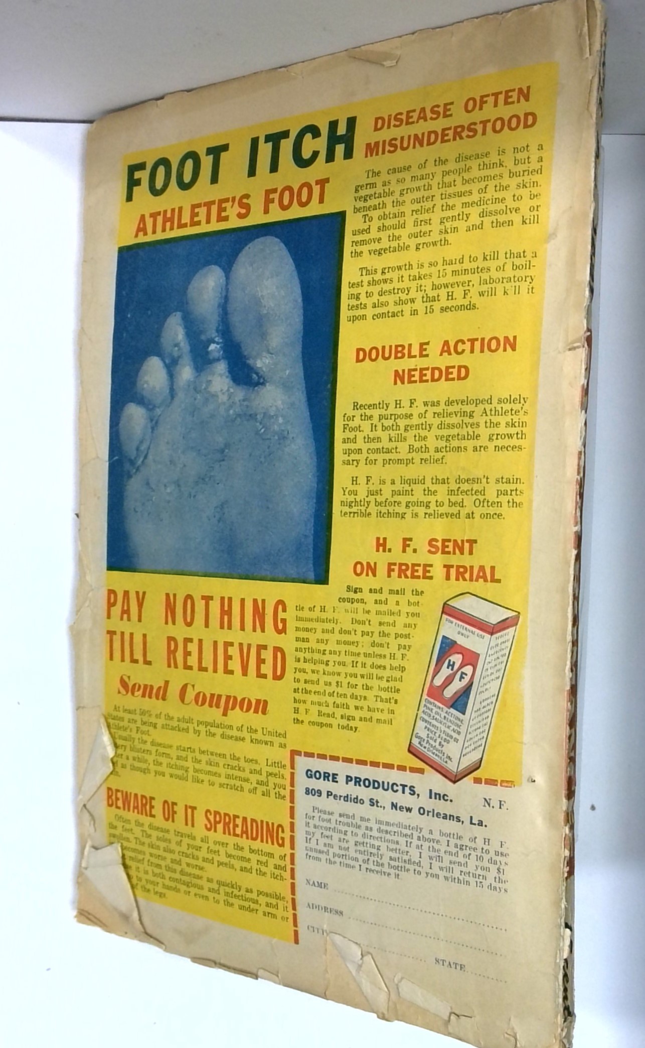 - Front cover detached 5%. Back cover detached 15%. Water damage: Moderate. Staple rust: Slight.