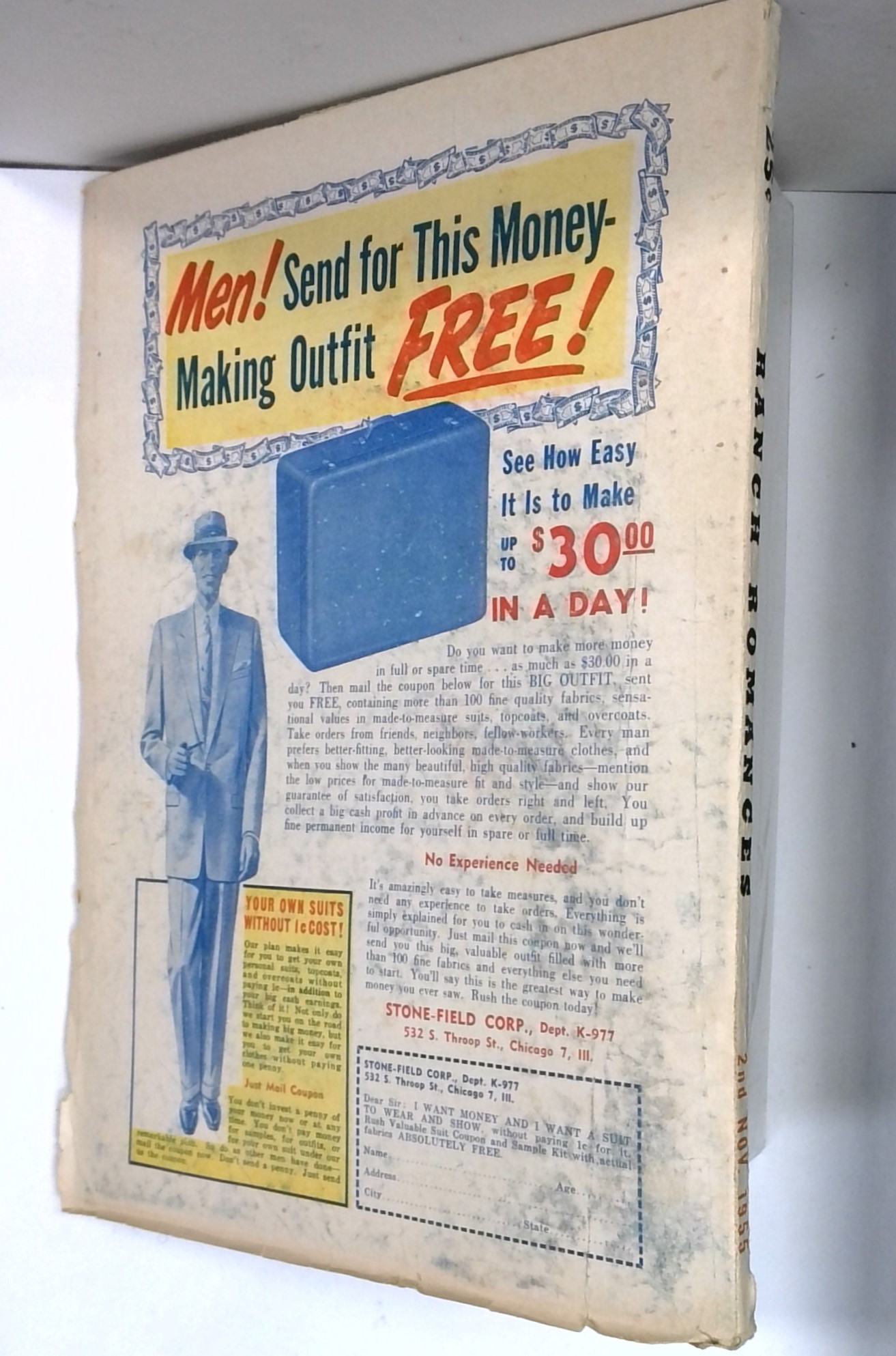 - Front cover detached 5%. Water damage: Moderate. Staple rust: Slight.