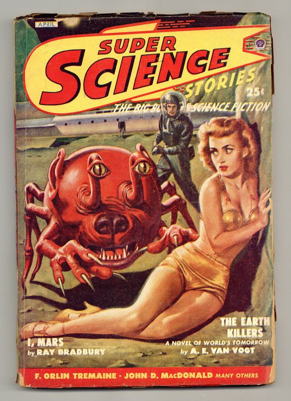 Vol. 5 #2 - April 1949. Short novels "The Earth Killers" by A.E. van Vogt, "Death Quotient" by John D. MacDonald. Novelettes: "Son of the Stars" by Orlin Tremaine, "Dhactwhu - Remember?" by Wilfred Morley. Short Stories: "I, Mars" by Ray Bradbury, "All Our Yesterdays" by John Wade Farrell, "Darkside Destiny" by James MacCreigh, "Delusion Drive" by Peter Reed. Frederik Pohl's Science Fictioneer column. Cover by Lawrence Sterne Stevens. Interior illustrations by Hannes Bok, Stevens, John Giunta, and Frank R. Paul. Letter from Chad Oliver. 7-in. x 10-in. 130 pages, B&W. Cover price $0.25.