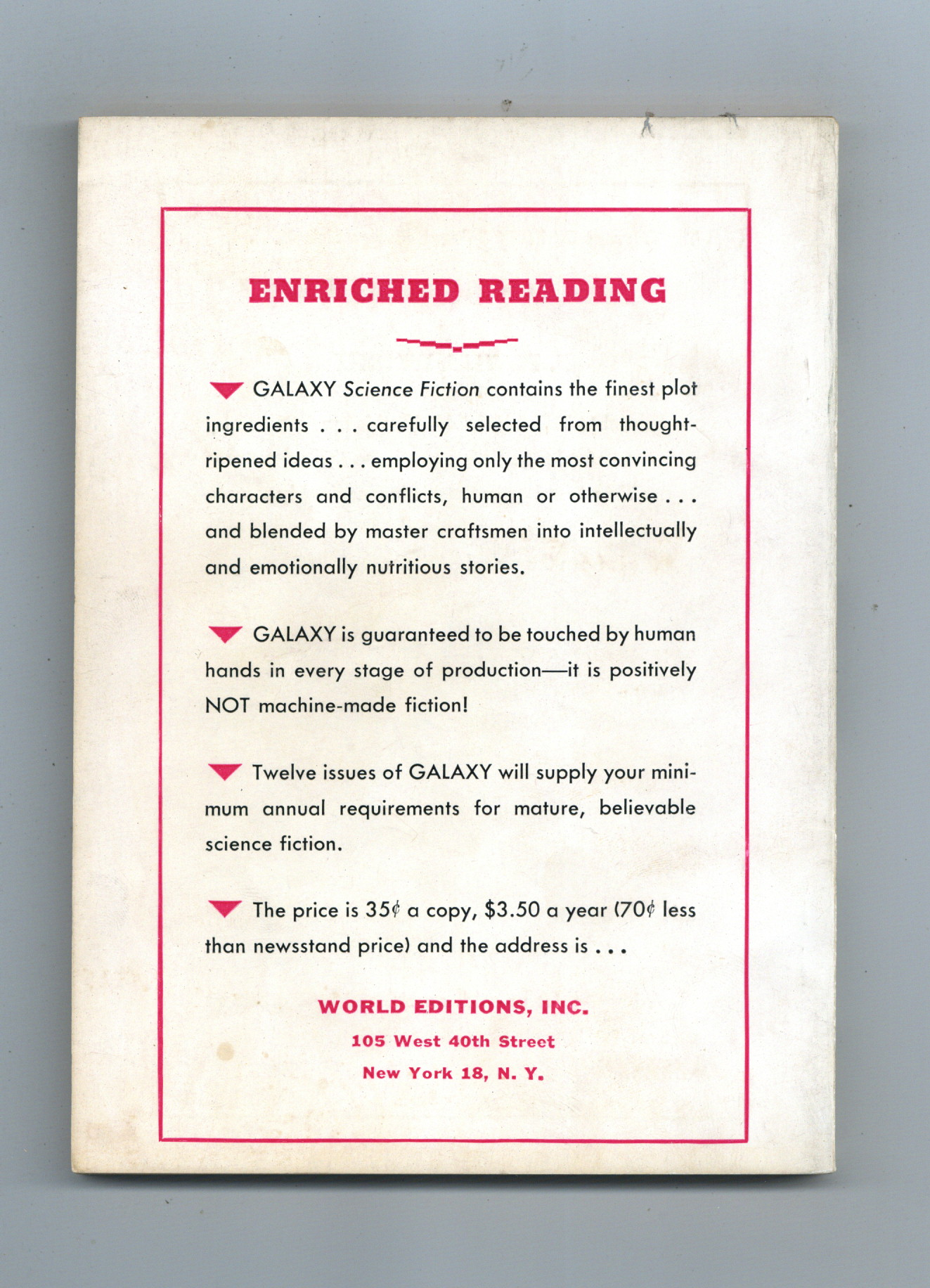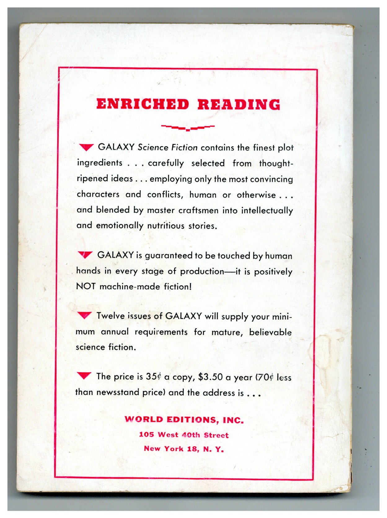 Published Jul 1951 by Galaxy Publications.$9.00Vol. 2, No. 4 - July , 1951. 5.5" x 7.5", 160 pages, B&W. Cover price $0.35.