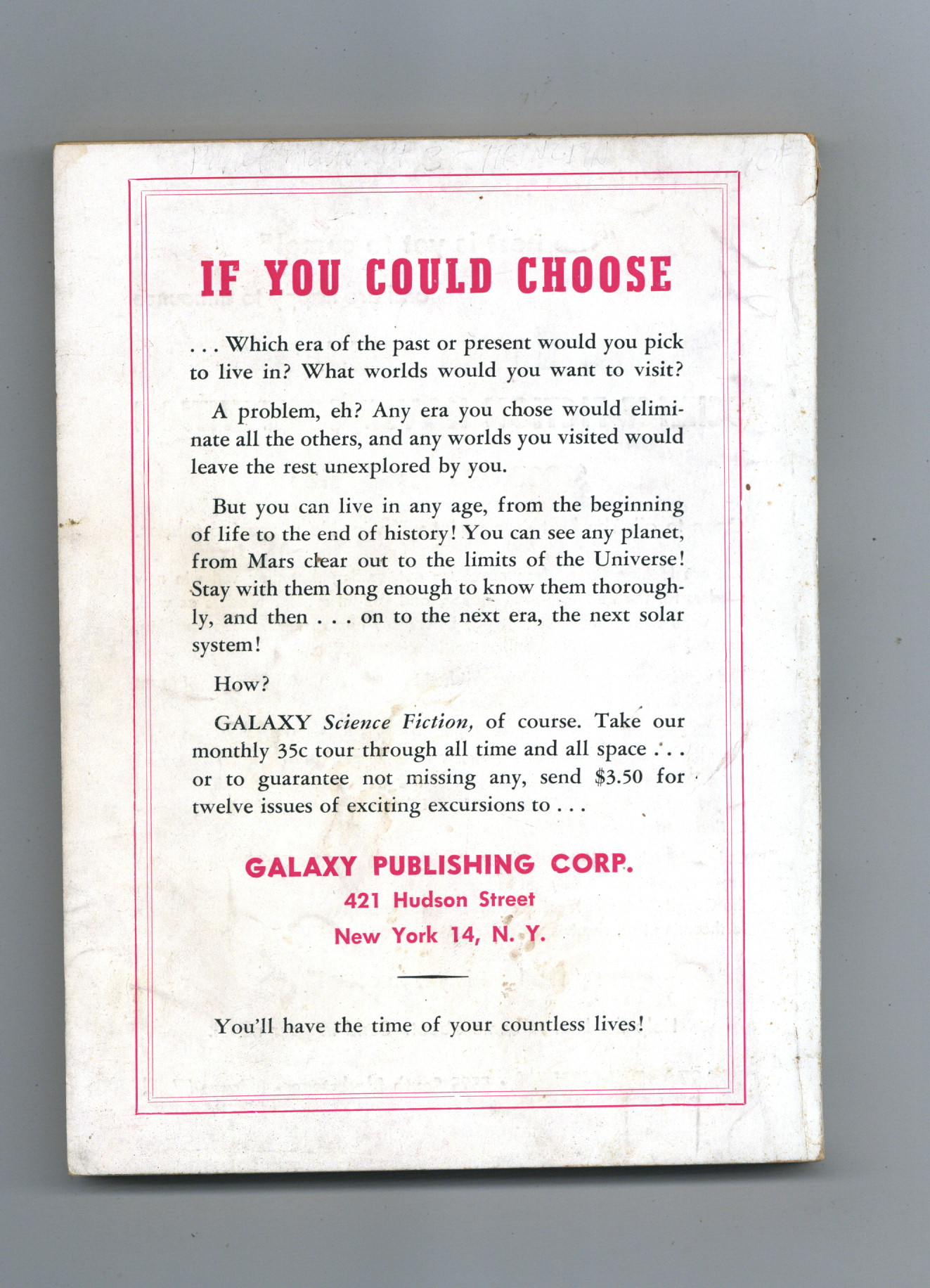 Published Nov 1951 by Galaxy Publications.$18.75- Back cover detached 5%. Staple rust: Slight.