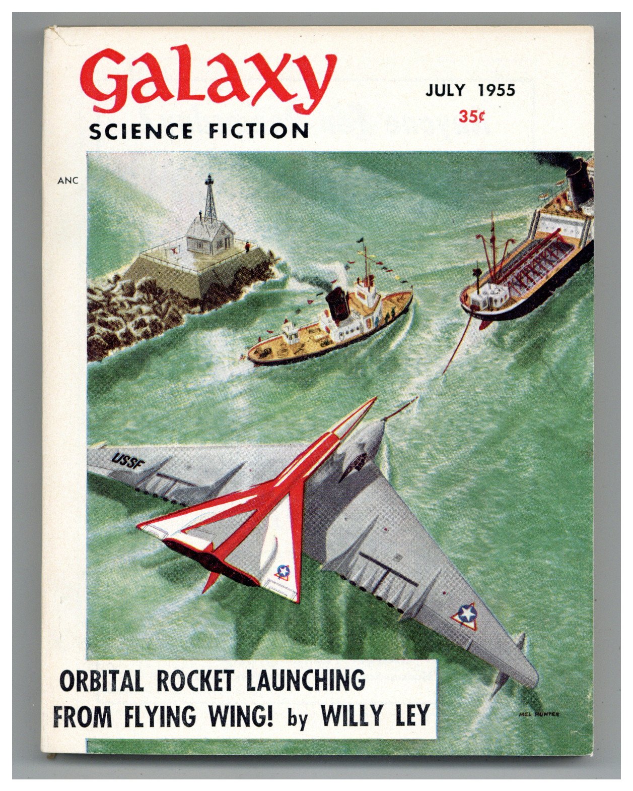 Published Jul 1955 by Galaxy Publications.$3.80July 1955. Cover by Mel Hunter. "The Mapmakers" by Frederik Pohl, "Property of Venus" by L. Sprague De Camp, "Deadhead" by Robert Sheckley, "Preferred Risk" by Edson McCann. 5 1/2-in. x 7 1/4-in., 144 pages, B&W. Cover price $0.35.