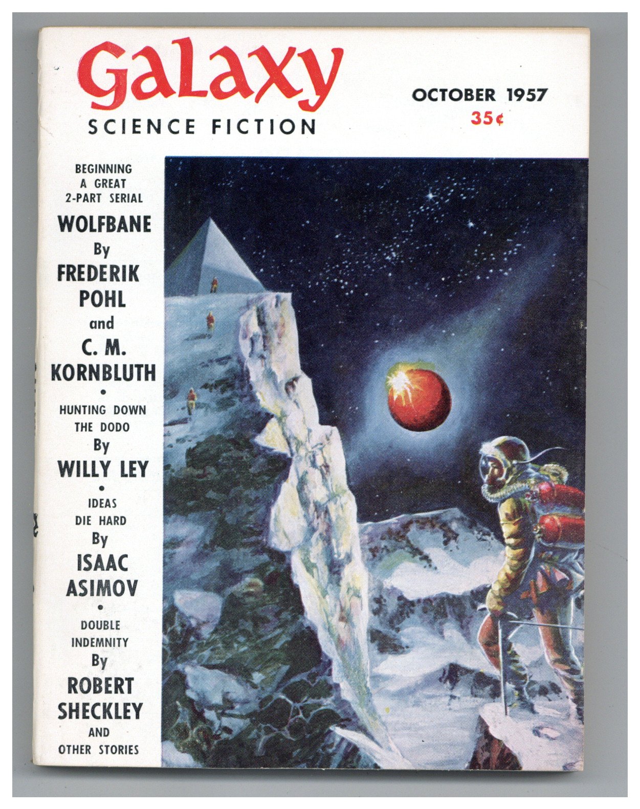 Published Oct 1957 by Galaxy Publications.$13.75Cover by Wallace Wood. Also short stories by Gordon Dickson and Daniel Galouye plus Willy Ley's science column. Interior art by Wood, Leo Dillon, Dick Francis. 5 1/2-in. x 7 1/4-in., 144 pages, B&W. Cover price $0.35.