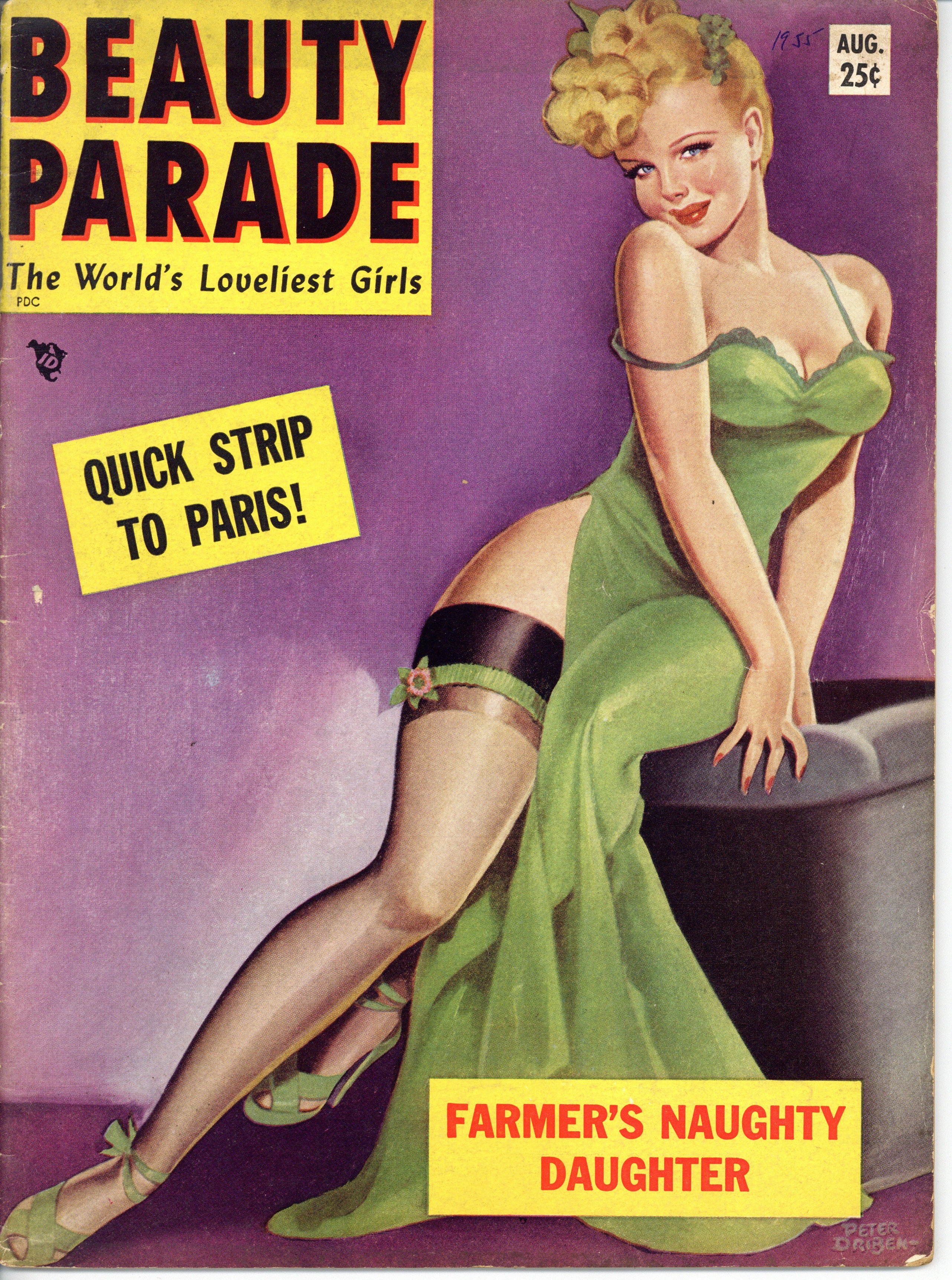 Vol. 14 #4 - Aug. 1955. Cover by Peter Driben. Page after page of models posed provocatively in two-page situations (e.g. "Farmer's Naughty Daughter," "Strippin' Sioux," and "Big Game Hunter"). Includes a nice pic of Bettie Page, nearly full page. 8 1/2-in. x 11 1/4-in., 50 pages, B&W. Cover price $0.25.