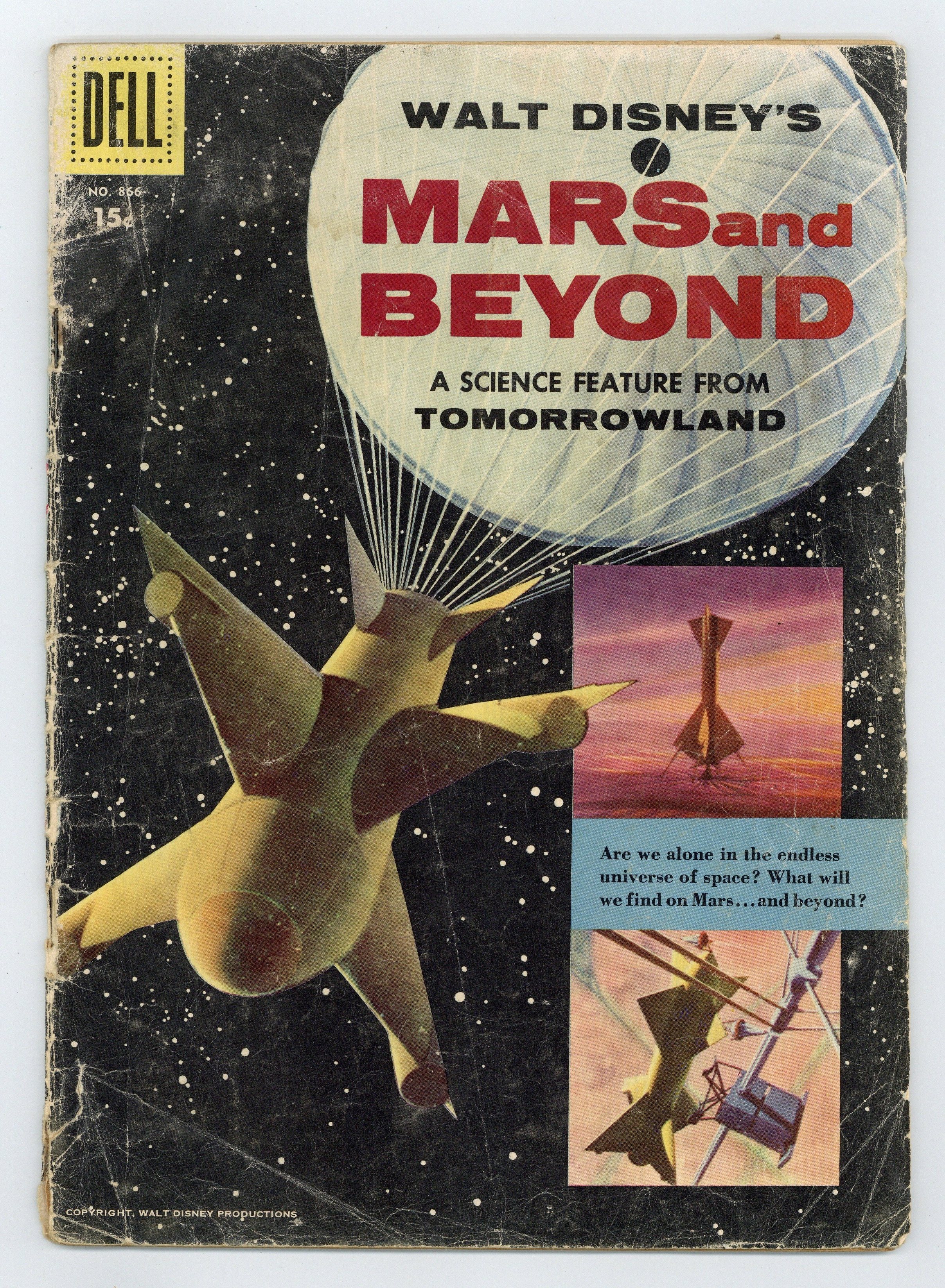 15ยข Price Variant. Walt Disney's "Mars and Beyond," A Science Feature From Tomorrowland - Written by Don R. Christensen. Art by Tony Sgroi. Are we alone in the endless universe of space? What will we find on Mars...and beyond? The issue also has the text articles "Another Science Factual," "Science Facts" and "The Eighteeen-Month Year." 36 pages, full color. Cover price $0.10.