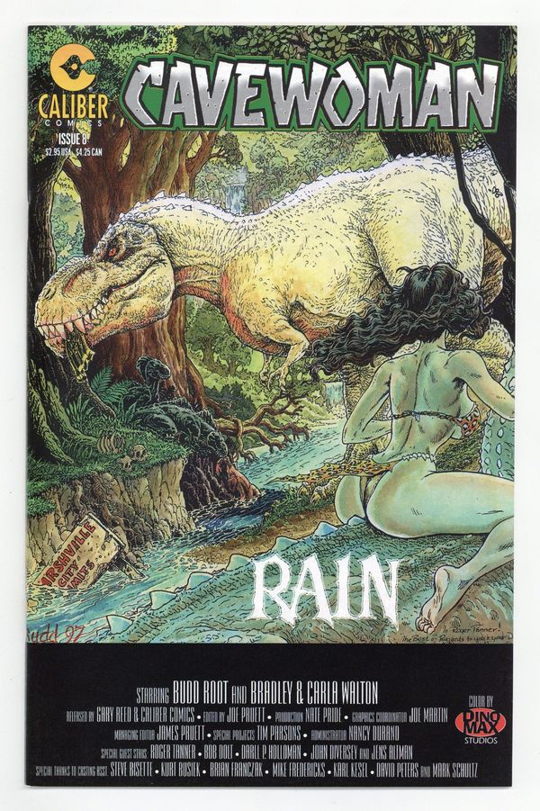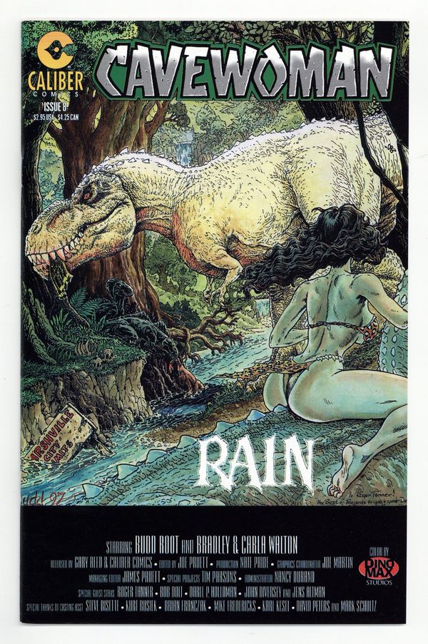 $7.49Regular cover by Budd Root. Story and art by Budd Root. The second series featuring voluptuous superwoman Meriem Cooper, who battles dinosaurs in the distant past. The townspeople decide to go on the offensive against the dinosaurs, but the results are disastrous. Final issue of the series; followed by the one-shot Cavewoman Meets the Explorers. 32 pages, B&W. Mature readers. Cover price $2.95.