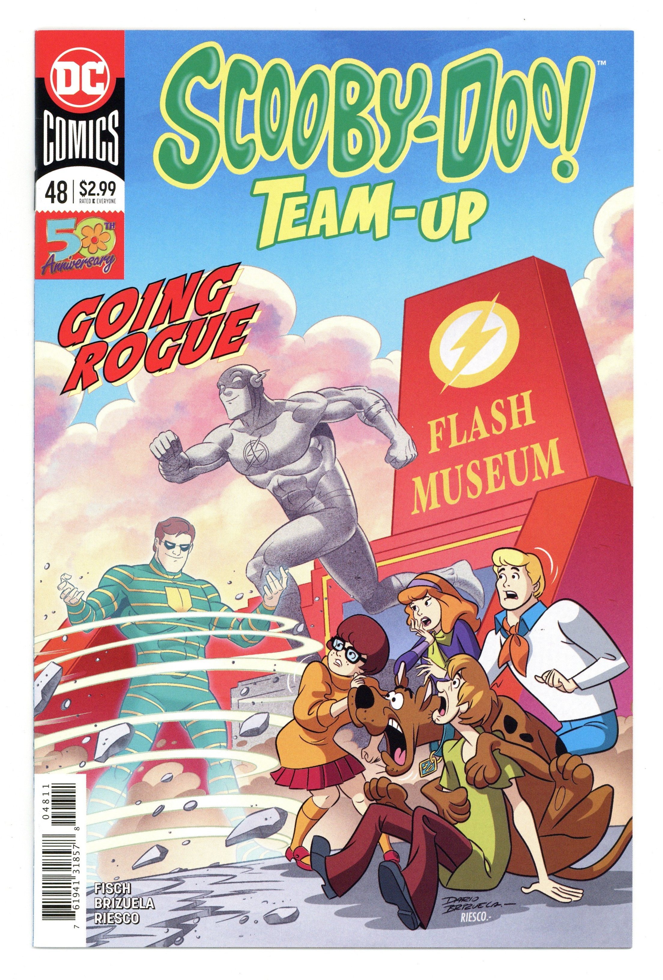 Written by Sholly Fisch. Art and Cover by Dario Brizuela. Over the years, Scooby and the gang have nabbed enough nefarious villains to fill a rogues gallery. But the tables are turned when they have to help a rogues gallery of the Flash's most nefarious super-villains! Can the gang rescue the Rogues from the ghost of a fellow Rogue-that sinister spinner, the Top? And if they do, can they also rescue themselves from the Rogues? 32 pages, full color. Rated E Cover price $2.99.