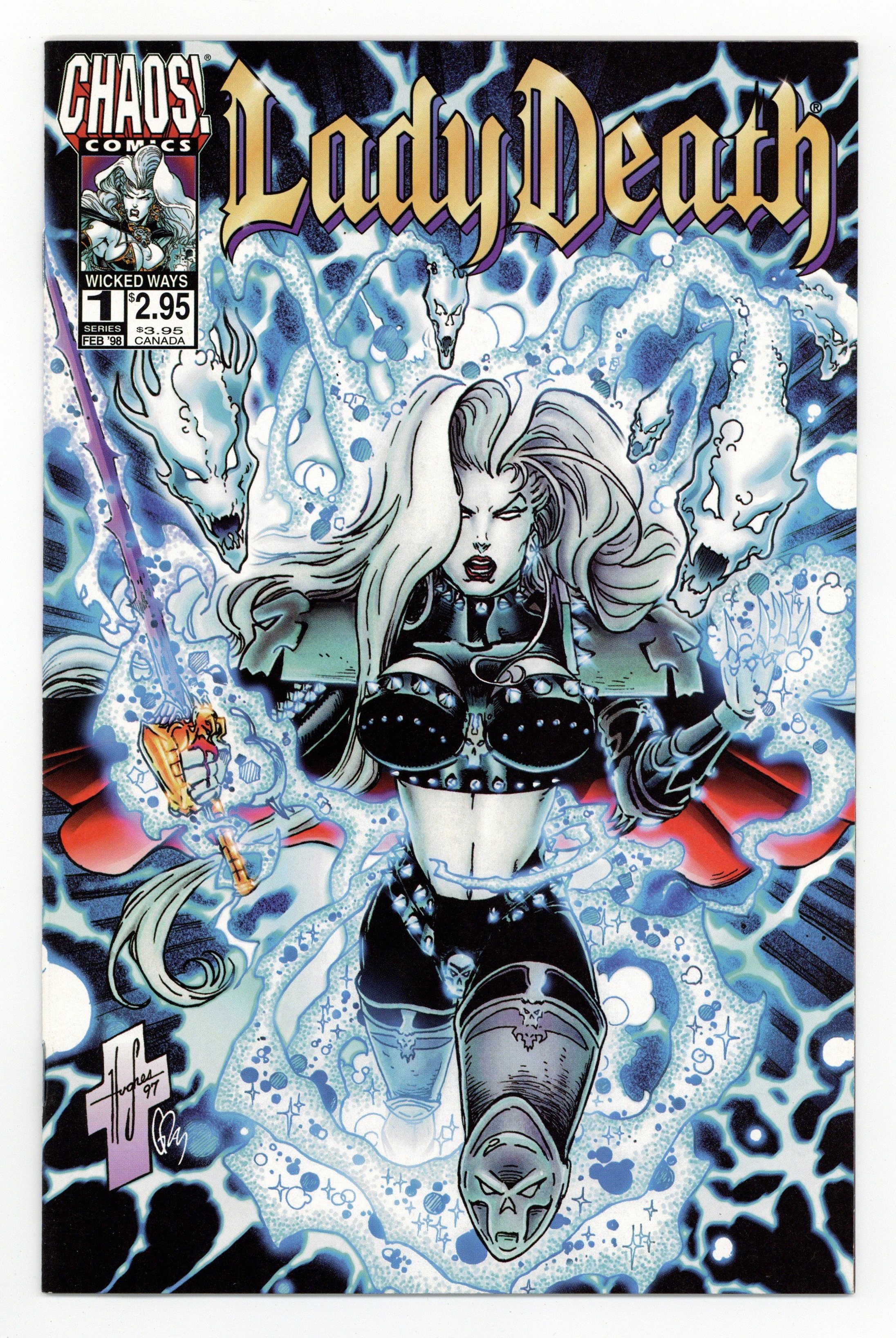 Cover by Steven Hughes. "Wicked Ways" [Part 1], script by Brian Pulido, art by Steven Hughes; Lady Death returns to Hell and begins to reassert her rule as queen of the realm; She kills the Demon, Vulbogliagh, who has taken over her castle and ruled in her absence; Cremator tracks Lady Demon to Lady Death's castle and is surprised to find his lady once again in residence. 36 pgs., full color. $2.95. Cover price $2.95.