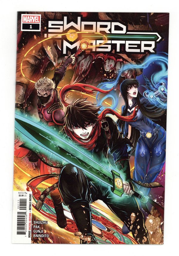 Written by Shuizhu and Greg Pak. Art by Gunji and Ario Anindito. Cover by Gunji. MIGHTY MARVEL MARTIAL ARTS DOUBLE TROUBLE! ALL NEW ONGOING SERIES! You saw him tear through Fire Goblins in WAR OF THE REALMS with his big, damn magic sword! Now learn the mysterious origins of LIN LIE, A.K.A. SWORD MASTER, Marvel's newest Chinese superhero, in the English language debut of the original series written by Shuizhu and drawn by Gunji! Haunted by dreams of demons, Lin Lie hunts for his missing archeologist father - and for the secret of the black sword he left behind. And in a brand new story written by Greg Pak (NEW AGENTS OF ATLAS), Sword Master teams up with SHANG-CHI! What happens when an undisciplined, untrained kid with a magic sword tangles with the one and only, undisputed MASTER OF KUNG FU? (Spoiler alert: they will indeed drive each other crazy, with huge ramifications for the Marvel Universe!) 36 pages, full color. Rated T+ Cover price $3.99.