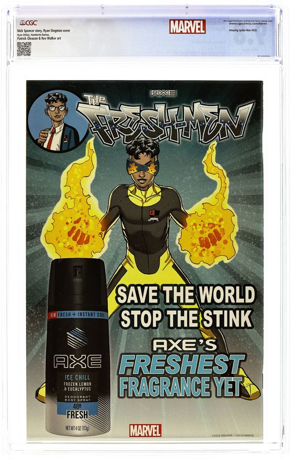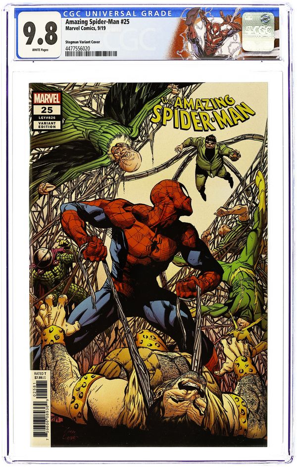 Limited 1 for 200 Retailer Incentive Variant Cover. Written by Nick Spencer, Zeb Wells and Keaton Patti. Art by Ryan Ottley, Kev Walker, Humberto Ramos, Patrick Gleason, Todd Nauck, Dan Hipp, Victor Olazaba, Dexter Vines and Cliff Rathburn. Cover by Ryan Stegman. Year two of Nick Spencer, Ryan Ottley and Humberto Ramos' run on ASM begins here! In the giant-sized main story, Spider-Man and Mary Jane find themselves in an INCREDIBLY tough situation, thanks to Electro. Can Spidey save MJ? CAN MJ SAVE SPIDEY? What is Mysterio cooking, and what does it have to do with the bandaged villain who has been on the periphery since #1?! All this, plus a story by Dan Hipp (TEEN TITANS GO! Art Director), internet sensation Keaton Patti and MORE! 68 pages, full color. Rated T Cover price $7.99.