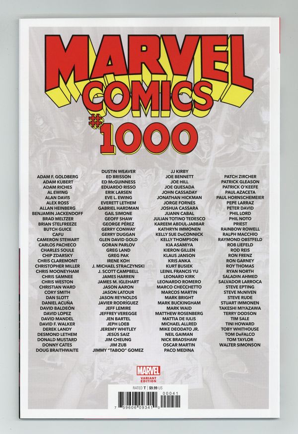 $9.00Limited 1 for 100 Retailer Incentive Variant Cover.Cover by Steve Ditko. THE GREATEST TALENT EVER ASSEMBLED FOR ONE STORY! THIS IS THE BIG ONE! In celebration of Marvel's 80th Anniversary, we have gathered together the greatest array of talent ever to be assembled between the covers of a single comic book! Names from the past, from the present, and even the future! Every page is filled with all-new work from this cavalcade of comic book luminaries! There is a mystery that threads throughout the Marvel Universe - one that has its origins in MARVEL COMICS #1 and which unites a disparate array of heroes and villains throughout the decades! What is the Eternity Mask, and who is responsible for the conspiracy to keep it hidden? And what new player will make their startling debut as these secrets are peeled away? Featuring the entirety of the Marvel Universe of characters! Written by Al Ewing, Jeremy Whitley, Mark Waid, Kathryn Immonen, Kurt Busiek, Joe Hill, Kieron Gillen, Jeph Loeb, Alex Ross, James M. Iglehart, Saladin Ahmed, Phil Lord, Christopher Miller, Walter Simonson, Gerry Duggan, Jonathan Lethem, Everett Lethem, Desmond Lethem, Priest, Kelly Sue DeConnick, Ryan North, Ralph Macchio, Jimmy "Taboo" Gomez, Benjamin Jackendoff, Jim Zub, Gerry Conway, Roy Thomas, Matthew Rosenberg, Charles Soule, Toby Whithouse, Rainbow Rowell, Donald Mustard, David Mandel, Eve L. Ewing, Brad Meltzer, Tom DeFalco, Glen David Gold, Ed Brisson, Adam F. Goldberg, Rob Liefeld, Erik Larsen, Jason Aaron, Donny Cates, Jonathan Hickman, Patrick Gleason, Gail Simone, Joe Quesada, Peter David, Chris Claremont, Kareem Abdul-Jabbar, Raymond Obstfeld, Kelly Thompson, Tini Howard, Tom Taylor, Allan Heinberg, David F. Walker, Greg Pak, Chip Zdarsky, J. Scott Campbell, Jason Reynolds, Dan Slott, Jeff Lemire, Neil Gaiman, Jason Latour, Derek Landy and J. Michael Straczynski. Art by Steve Epting, Patch Zircher, Leonardo Romero, Joshua Cassara, Irene Koh, John Cassaday, Stuart Immonen, Ron Garney, Leonard Kirk, Phil Noto, Cameron Stewart, Gabriel Hardman, Michael Allred, Doug Braithwaite, Tim Sale, Cory Smith, Chris Weston, Eduardo Risso, CAFU, Klaus Janson, Alex Ross, Oscar Martin, Steve Rude, Javier Rodriguez, Alvaro Lopez, Walter Simonson, Chris Samnee, Paul Hornschemeier, Brian Stelfreeze, Joe Bennett, Ruy Jose, David Lopez, James Harren, Marco Checchetto, Jeffrey Veregge, Nick Bradshaw, Greg Land, Jay Leisten, Rod Reis, Leinil Francis Yu, George Perez, Terry Dodson, Rachel Dodson, Carlos Pacheco, Rafael Fonteriz, Alan Davis, Kris Anka, Donald Mustard, Butch Guice, Jen Bartel, Julian Totino Tedesco, Ron Frenz, Brett Breeding, Chris Mooneyham, Mark Bright, Scott Hanna, Jorge Fornes, Adam Riches, Daniel Acuna, Rob Liefeld, Erik Larsen, Goran Parlov, Geoff Shaw, Dustin Weaver, Patrick Gleason, David Baldeon, Joe Quesada, Kevin Nowlan, Adam Kubert, Salvador Larroca, Mattia De Iulis, Pepe Larraz, Kia Asamiya, Juann Cabal, Jim Cheung, JJ Kirby, Takeshi Miyazawa, Chip Zdarsky, Jesus Saiz, J. Scott Campbell, Patrick O'Keefe, Marcos Martin, Jeff Lemire, Mark Buckingham, Jason Latour, Paco Medina, Ed McGuinness, Mark Morales, Steve McNiven, Christian Ward, Mike Deodato, Jr. and Paul Azaceta. 96 pages. full color. Rated T Cover price $9.99.