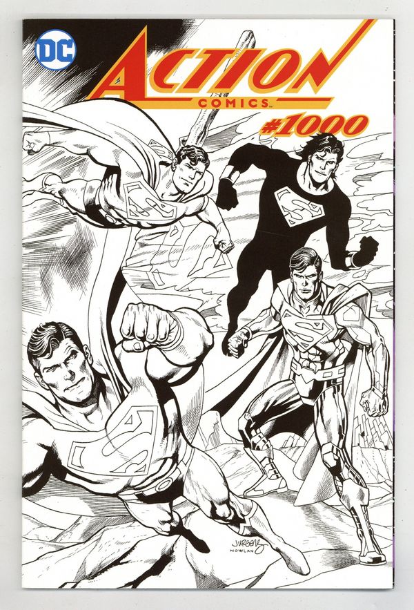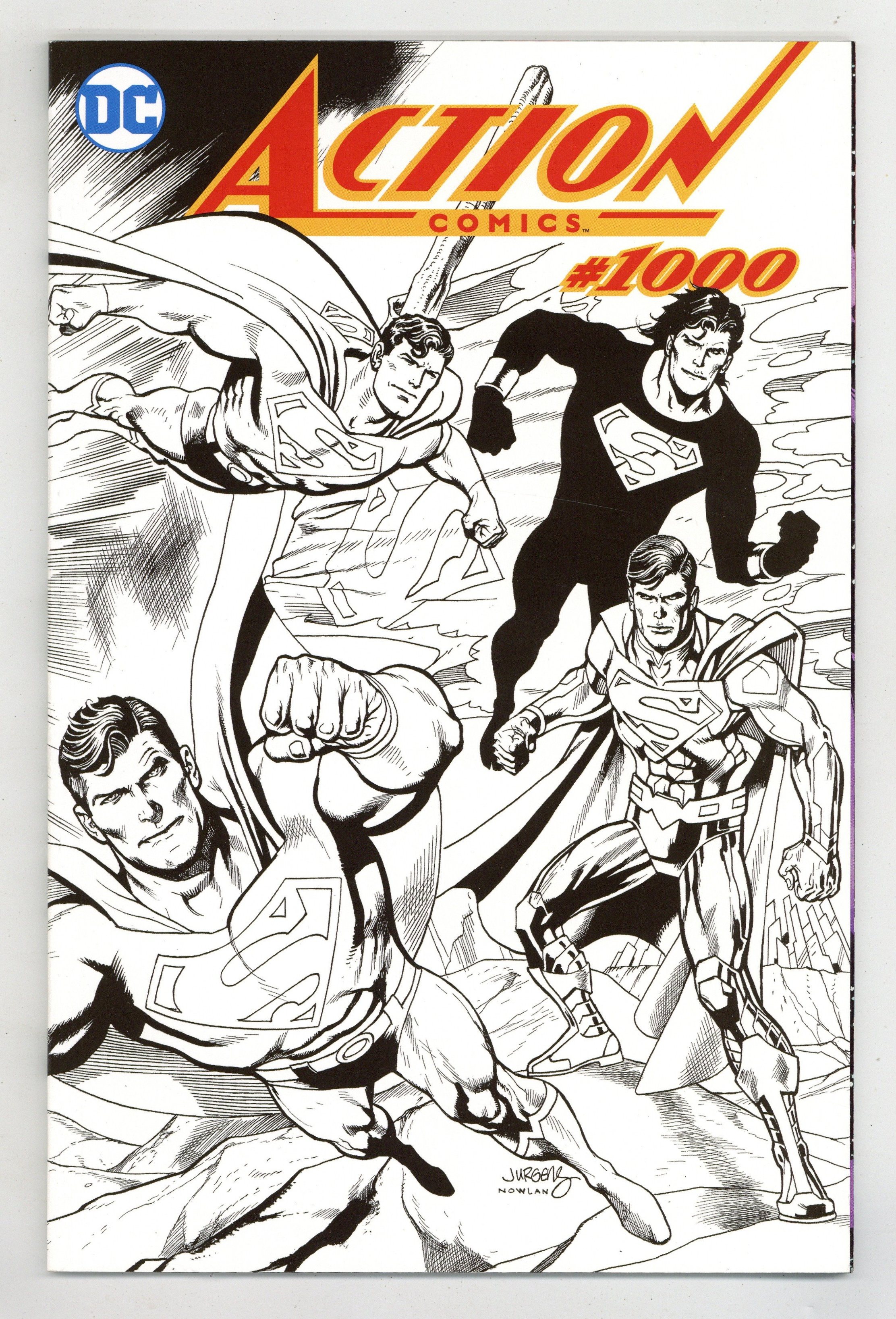 Dynamic Forces Exclusive Black and White Wraparound Variant cover by Dan Jurgens - Limited to 1938 copies. Includes certificate of authenticity. Written by Dan Jurgens, Peter J. Tomasi, Marv Wolfman, Geoff Johns, Richard Donner, Scott Snyder, Tom King, Louise Simonson, Paul Dini, Brad Meltzer and Brian Michael Bendis. Art by Dan Jurgens, Norm Rapmund, Patrick Gleason, Curt Swan, Butch Guice, Kurt Schaffenberger, Olivier Coipel, Rafael Albuquerque, Clay Mann, Jerry Ordway, José Luis García-López, Kevin Nowlan, John Cassaday, Jim Lee and Scott Williams. Celebrate 1000 issues of Action Comics with an all-star lineup of top talent as they pay tribute to the comic that started it all! From today's explosive action to a previously unpublished tale illustrated by the legendary Curt Swan to the Man of Tomorrow's future, this very special, oversized issue presents the best of the best in Superman stories! Featuring: "From the City That Has Everything" by Dan Jurgens and Norm Rapmund; "Never-Ending Battle" by Peter J. Tomasi and Patrick Gleason; "An Enemy Within" by Marv Wolfman, Curt Swan, Butch Guice and Kurt Schaffenberger (note: original story by Cindy Goff, Swan and Guice, with the final page courtesy of Superman The Secret Years (1985) #2 by Bob Rozakis, Swan and Schaffenberger); "The Car" by Geoff Johns, Richard Donner and Olivier Coipel; "The Fifth Season" by Scott Snyder and Rafael Albuquerque; "Of Tomorrow" by Tom King and Clay Mann; "Five Minutes" by Louise Simonson and Jerry Ordway; "Actionland!" by Paul Dini, José Luis García-López and Kevin Nowlan; "Faster Than a Speeding Bullet" by Brad Meltzer and John Cassaday; and "The Truth" by Brian Michael Bendis, Jim Lee and Scott Williams. Plus: Pin-ups by John Romita, Jr. and Danny Miki, Walter Simonson, and Jorge Jimenez. Softcover, 80 pages, full color. Rated T Cover price $7.99.