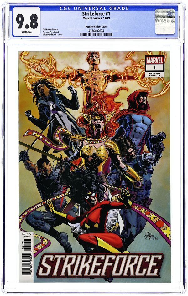 Written by Tini Howard. Art by German Peralta. Cover by Mike Deodato. NO COMPROMISE. NO MERCY. ALL NEW, ONGOING SERIES! From the dark minds of rising stars Tini Howard and Germán Peralta comes a tale of the underside of the Marvel Universe! A new threat is secretly taking over the planet -- and the more people who know about it, the more powerful the threat becomes. Blade dealt with this threat once before, and hoped to never have to again. He can't bring the Avengers in on this -- not just for their own safety, but for the safety of everyone on Earth. So he must recruit a team of heroes accustomed to darkness -- a strikeforce. Blade, Angela, Spider-Woman, Wiccan, the Winter Soldier, Monica Rambeau and Daimon Hellstrom join forces to fight the fights that no other Marvel team can take on! 28 pages, full color. Rated T+ Cover price $3.99.