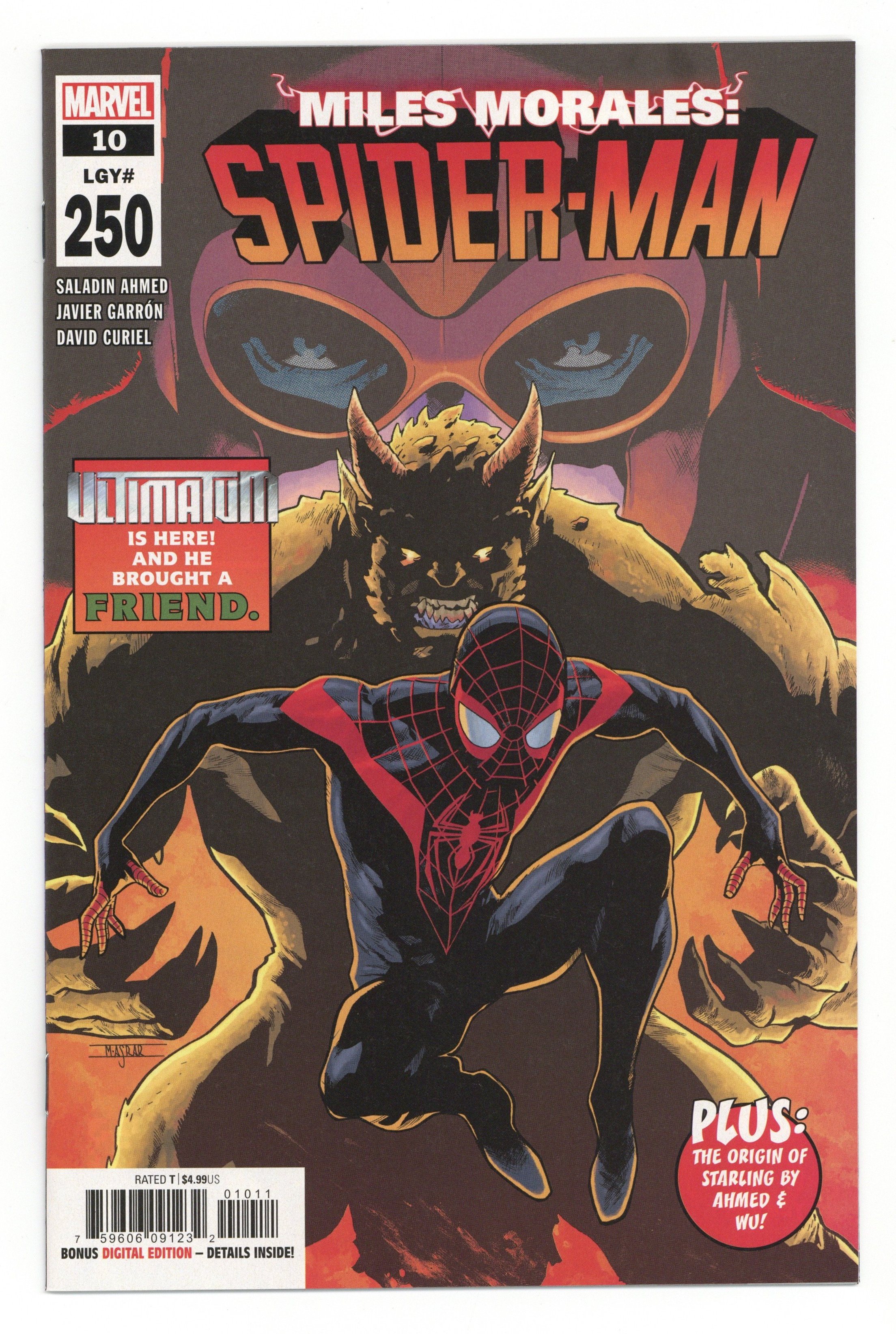 Written by Saladin Ahmed. Art by Javi Garron and Annie Wu. Cover by Mahmud Asrar. SPIDER-SEMIQUINCENTENNIAL OR BIG 250th ANNIVERSARY ISSUE? That's right, it's our 250th issue and it's Miles Morales' birthday! But YOU'RE getting all the gifts! A mystery dating back to Miles' first appearance? Answered! A terrifying villain destined to become one of Miles' greatest adversaries? Revealed! Special guests, like maybe Peter Parker: Spider-Man? YOU KNOW IT! All busting out of 25 pages by main series storytellers Saladin Ahmed and Javier Garrón, PLUS a bonus back-up by Ahmed and a special guest artist delving into the history of your new favorite character, STARLING! Your FOMO is well-founded! DON'T MISS IT! 36 pages, full color. Rated T Cover price $4.99.