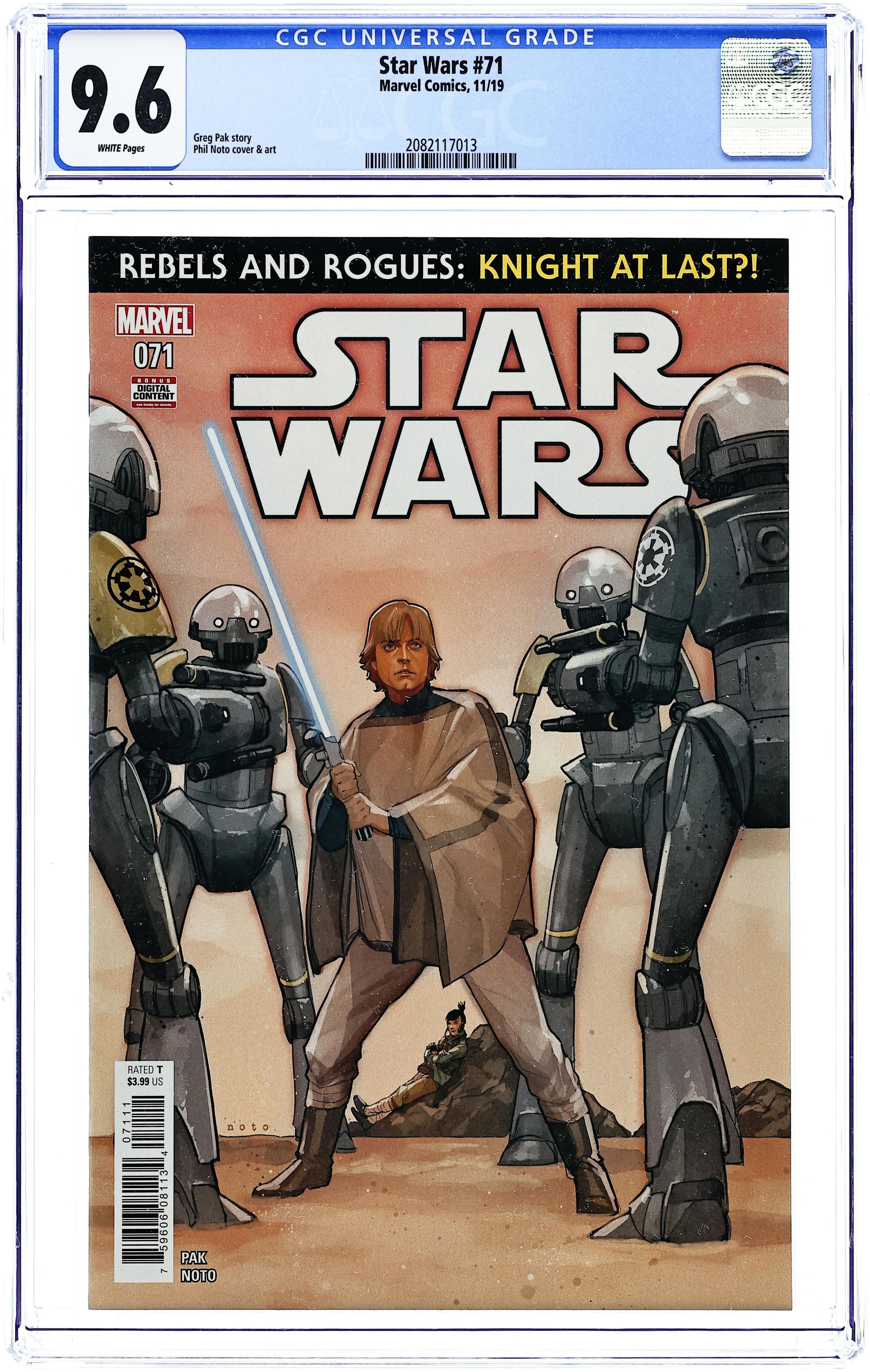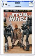 Rebels and Rogues: Part 4 of 8 - Written by Greg Pak. Art and Cover by Phil Noto. RUIN AMONG THE ROCKS! The REBELS AND ROGUES epic continues as our heroes' mission to divert the IMPERIAL FLEET spins out of control! On K43, the Rock Elders probe THREEPIO'S memories - and allegiances! Could a droid have more in common with a rock monster than a human? On Lanz Carpo, a rogue takes a fall and a princess fights a vigilante. And on Kalakan, LUKE robs a bank. Wait, LUKE ROBS A BANK??? 28 pages, full color. Rating T Cover price $3.99.