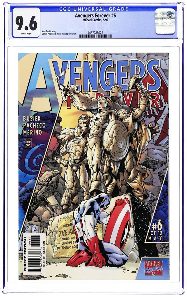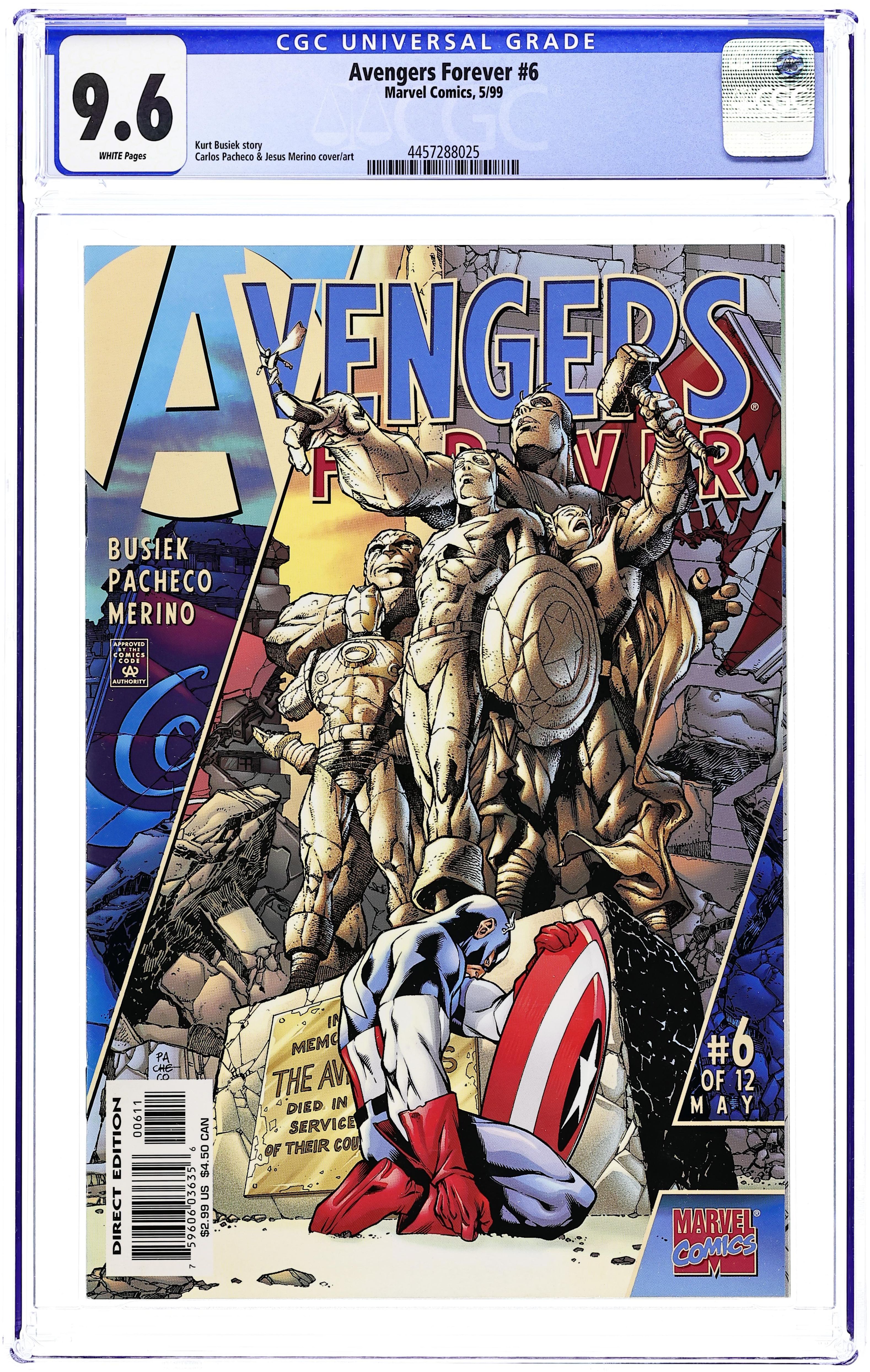 "In the Meantime, the In-Between Times" Plot by Kurt Busiek and Roger Stern. Script by Kurt Busiek. Pencils by Carlos Pacheco. Inks by Jesús Merino. Cover by Carlos Pacheco and Jesús Merino. With mere seconds to spare, Captain Marvel and the Wasp escape from 1959 California just as Immortus prunes the timeline! While in the mid-21st century, Captain America and Giant-Man travel to Wakanda to make their final stand against the Martians! And in 1873 Arizona; Songbird tells Hawkeye and Yellowjacket not to interfere in the clash between Kang and the Western Gunfighters! Because Earth's Mightiest Heroes will win that battle later (in the classic Avengers 143). Eventually, all seven avengers rendezvous back at the Sphinx time machine. Where they realize the only way to beat Immortus...is to take the fight to Immortus...starting next issue! Appearances by Rick Jones, Kang, Kid Colt, Rawhide Kid, Ringo Kid, Two-Gun Kid, and the Night Rider. (Note: This twelve-part series was reprinted in 2011 in the trade paperback: Avengers Forever.) 32 pages. Cover price $2.99.