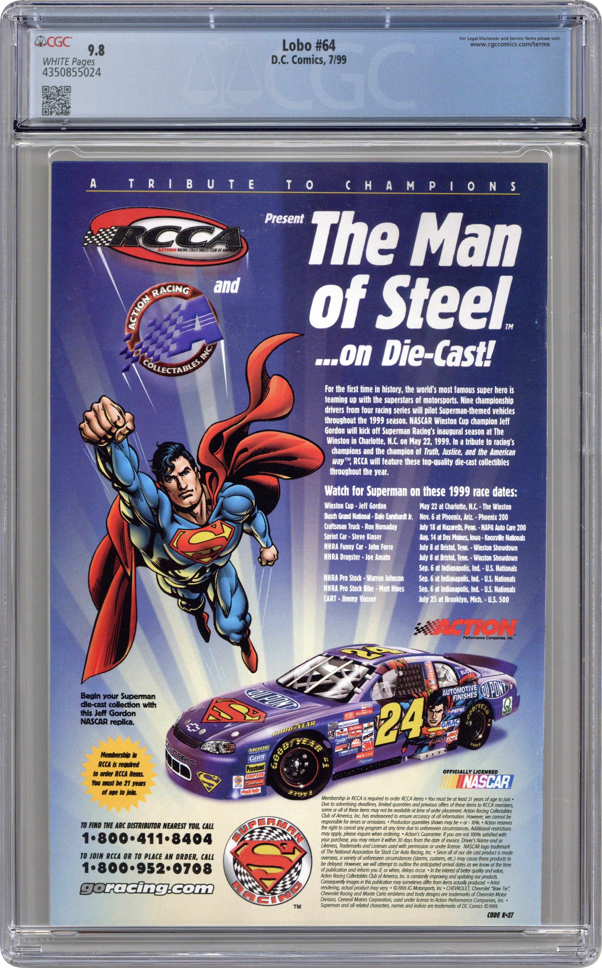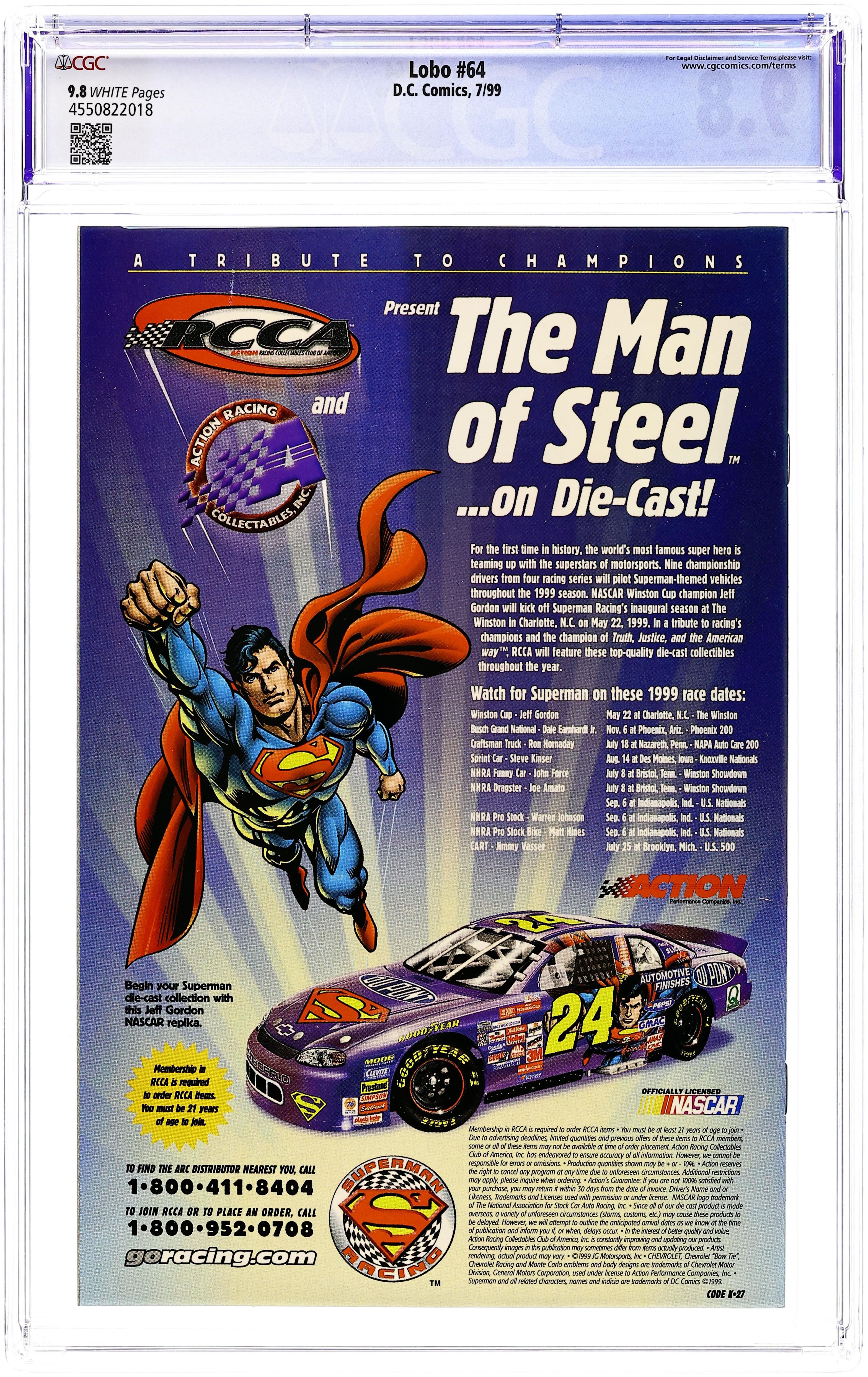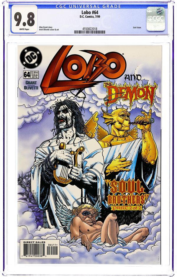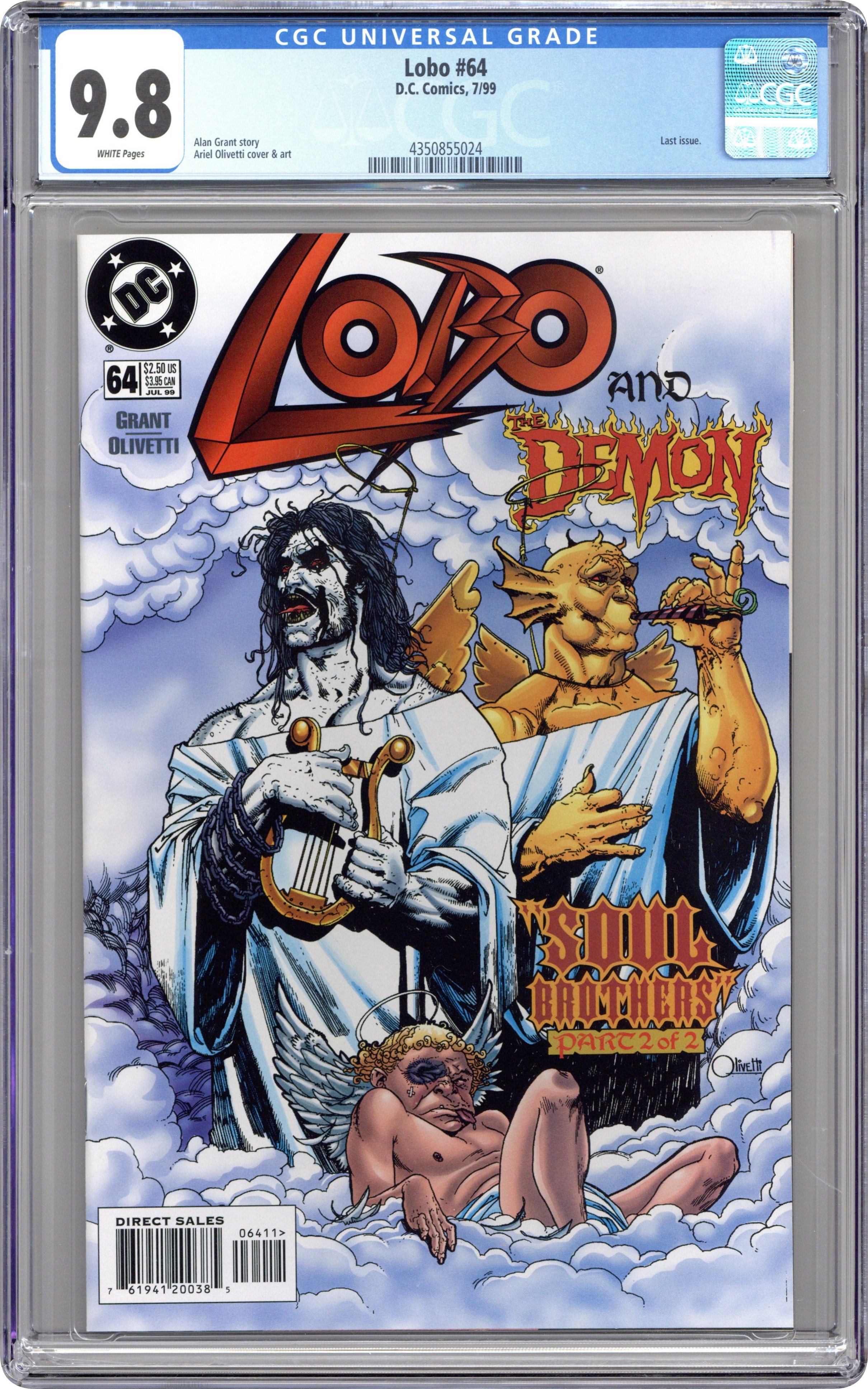 Cover art by Ariel Olivetti. "Soul Brothers, Part Two: The Gospel According to Lobo," script by Alan Grant (as Matthew Grant), art by Ariel Olivetti (as Mark Olivetti); Lobo regains consciousness within a black void, not knowing where he is or how he arrived here; Without warning he is suddenly struck by some invisible force; The blows continue to come from the darkness until the Main Man decides to fight back; He throws his fists hoping to land a punch on his mysterious assailant; Also enveloped by the pitch, Etrigan is blind-sided by an unseen foe. After being struck several times, the Demon ignites a flame in the palm of his hand to illuminate his surroundings, revealing his former ally Lobo to be the source of the fighting; As the two combatants brutalise each other, Lord Nytemayr watches with pleasure as his captives are pitted against one another, trapped within the illusion of his Sphere of a Thousand Nightmares. 36 pgs., full color. Cover price $2.50.