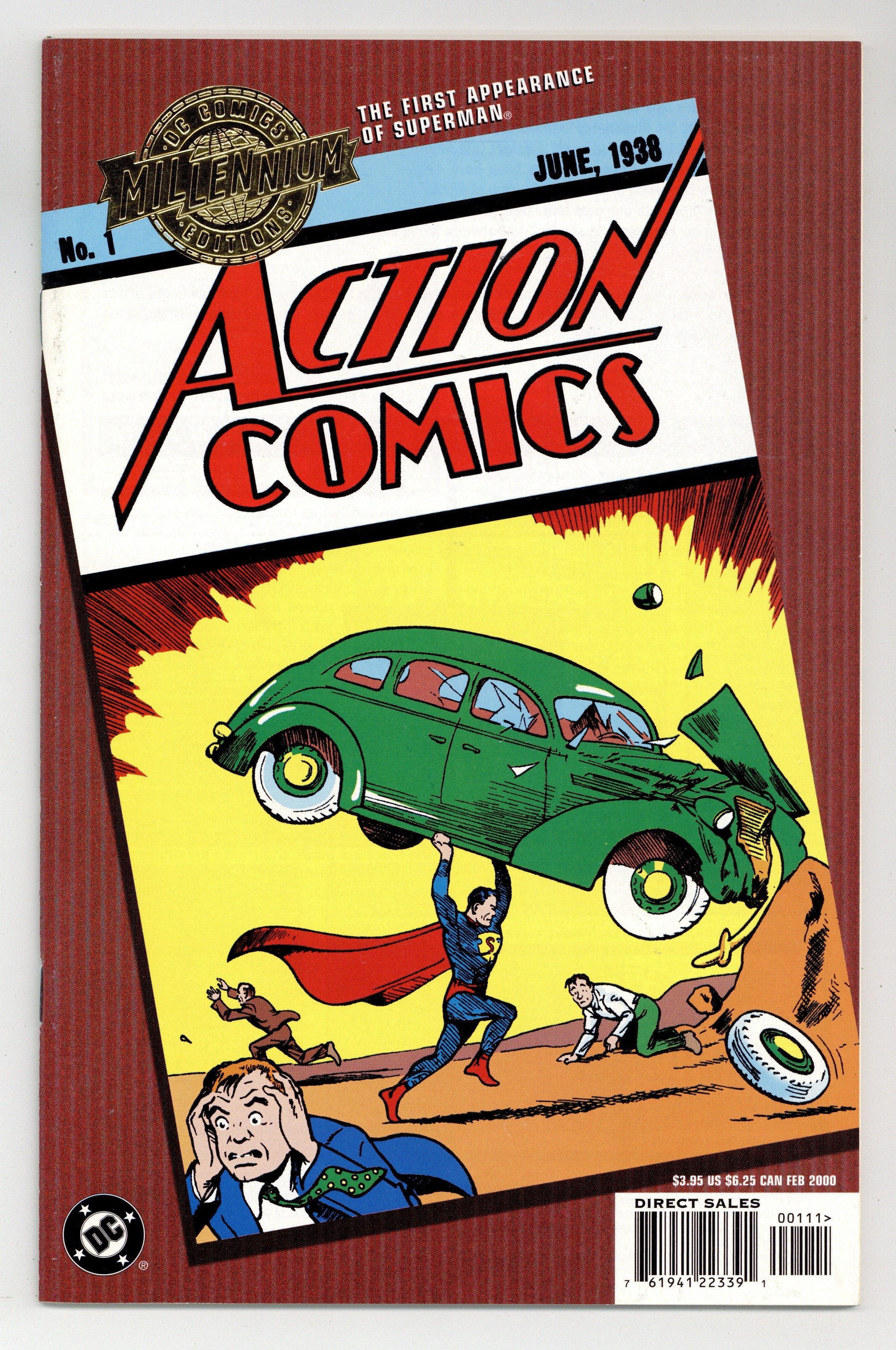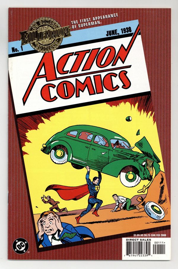 Cover art Joe Shuster. Written by Jerry Siegel, Fred Guardineer, Bernard Baily, and others. Art by Joe Shuster, Bailey, Will Ely, Guardineer, Sven Elven, H. Fleming, and others. The first appearances of Superman, Lois Lane and Zatara the magician are just some of the stories featured in this reprint of 1938's ACTION COMICS #1, one of the most important comics of all time. FC, 64 PG" Cover price $3.95.