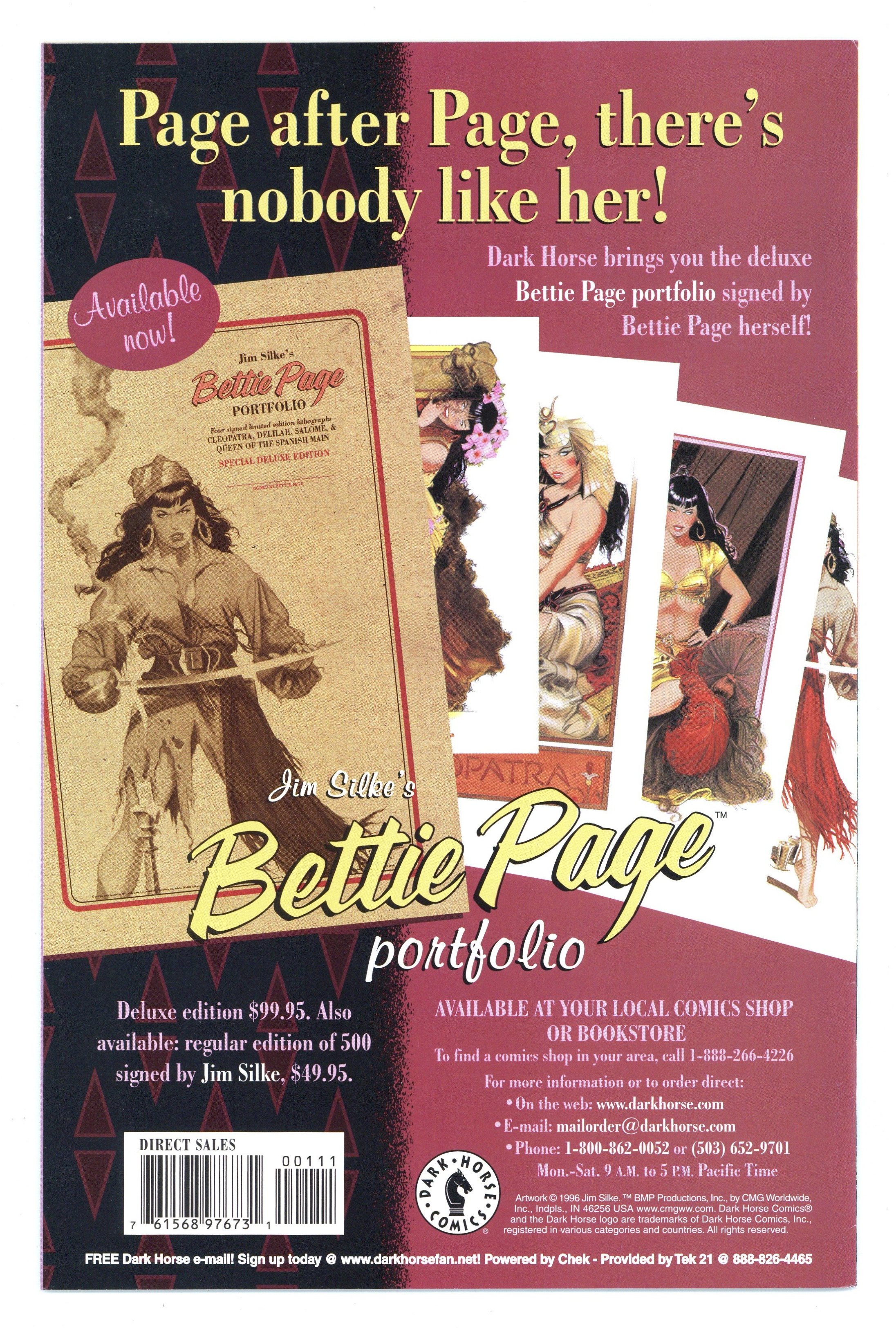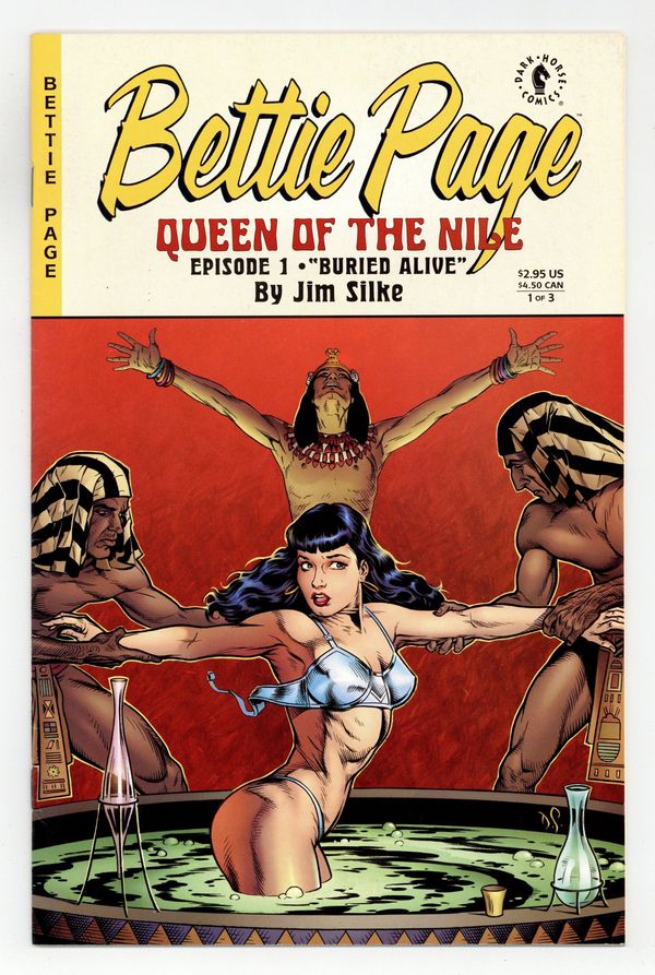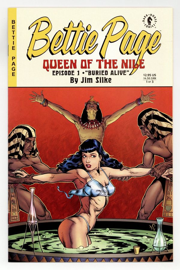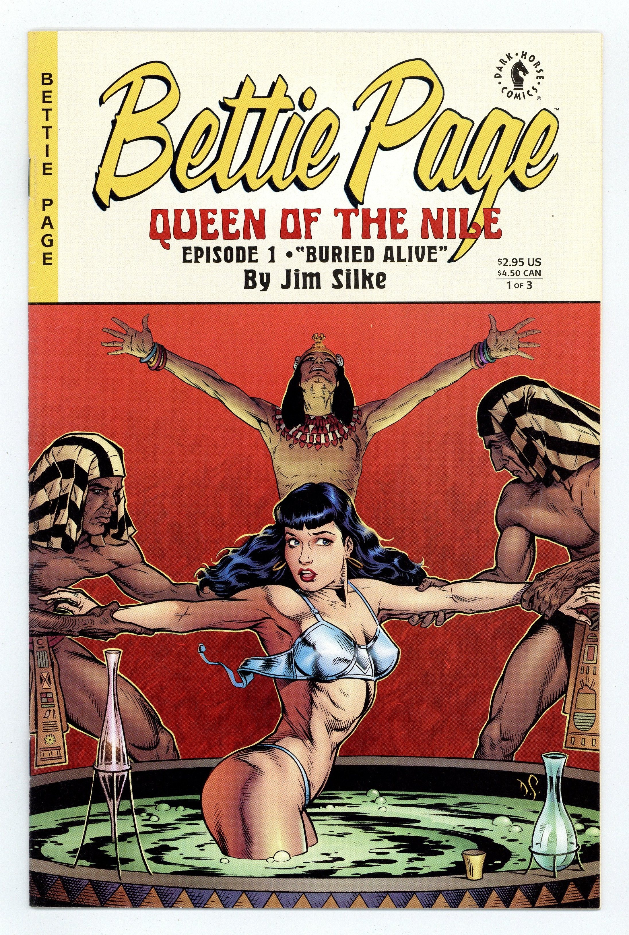 Published Dec 1999 by Dark Horse.$57.00by Jim Silke; cover by Dave Stevens Bettie's back! And she's right where she belongs: in all kinds of trouble! This time, it's a low-budget time machine that mistakenly transports her to ancient Egypt where she battles the High Priest of Amon Ra, assorted thugs, and a lovesick mummy twice her size. She wiggles and squirms, and even bumps and grinds, to avoid their evil clutches, but she can't avoid the inevitable: everyone falls in love with her, she loses her clothes (frequently), and gets she thrown into a "bottomless pit" to be buried alive. Jim Silke continues the story he began in Bettie Page: Spicy Adventures, with Dave Stevens as cover artist. On sale December 1 FC, 32pg (1 of 3)" Cover price $2.95.